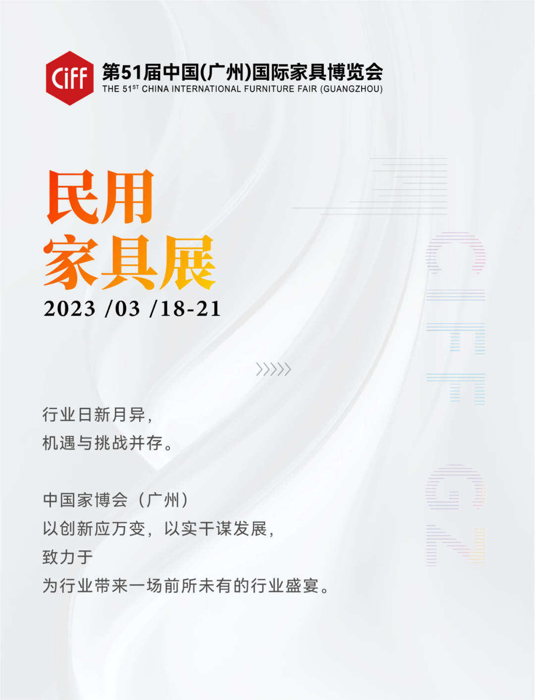 2023年3月18日-21日,第51届中国家博会(广州)民用家具展将焕新上线,期待与你共同解锁家居新纪元!
