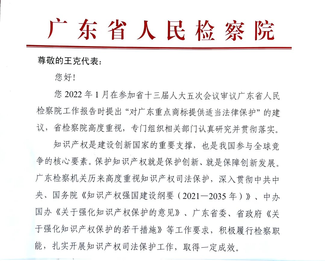 广东省人民检察向王克代表发来书面《答复函》表示,您在省十三届人大五次会议审议《广东省人民检察工作报告》时,提出“广东对重点商标提供适当法律保护”的建议,省检察院高度重视,专门组织相关部门认真研究并贯彻落实。
