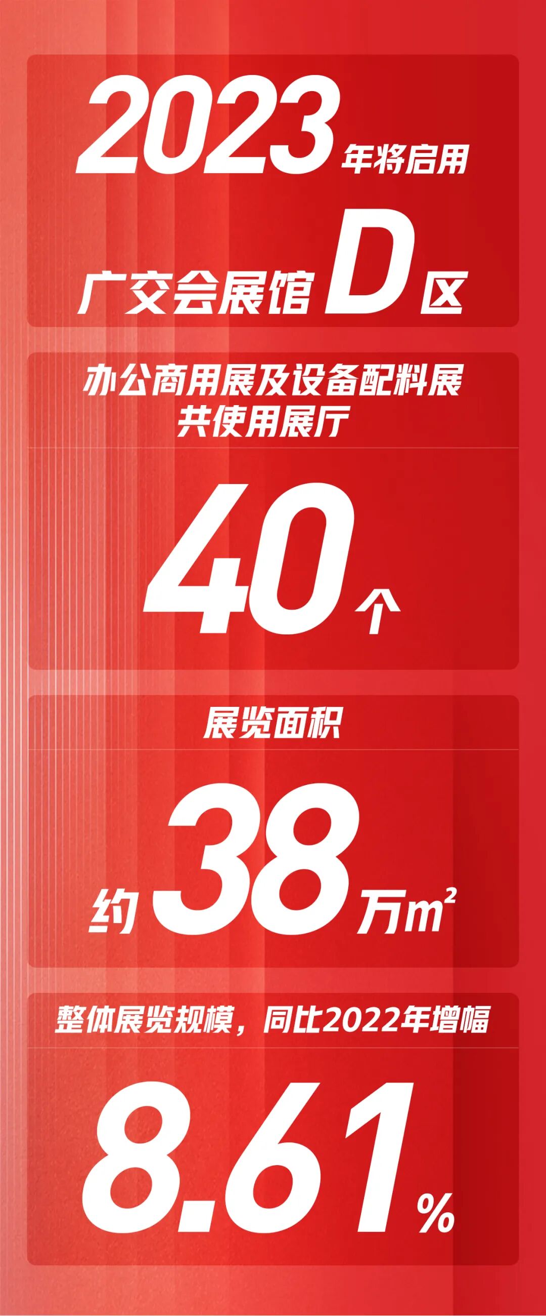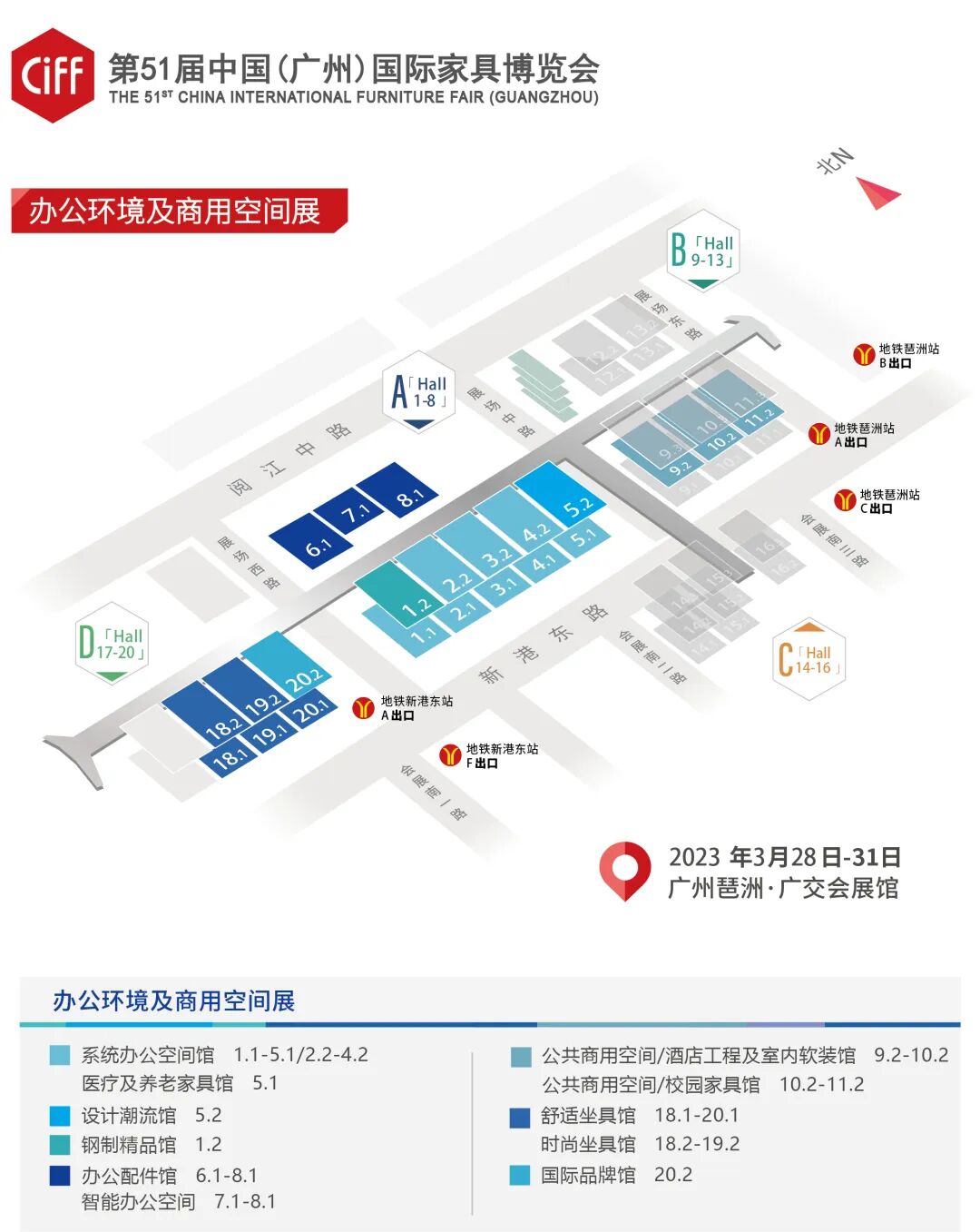 办公环境及商用空间展,使用广交会展馆A/B/D区共22个展厅,展览规模超过22万平方米。A区办公环境题材、B区商用空间题材、D区坐具题材形成“三馆相连”布局,行业头部品牌悉数亮相,共同打造办公商用一站式采购平台,引领绿色、低碳办公商业新潮流。