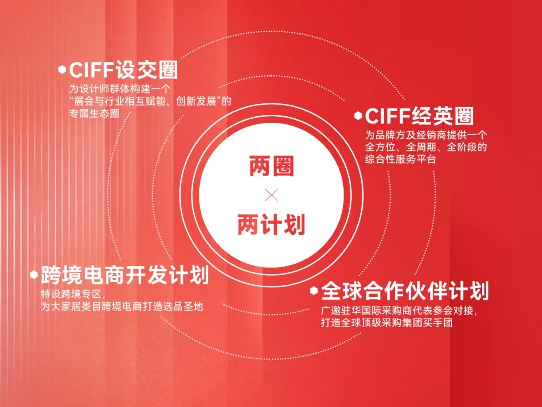 依托家居全题材全产业链优势,中国家博会(广州)联动多方资源,打造CIFF设交圈、CIFF经英圈两大聚焦内销观众群体的品牌项目,及“跨境电商开发计划”、“全球合作伙伴计划”两大外销聚焦内销观众群体的品牌项目,促进引领大家居行业的高效对接与高质量发展。