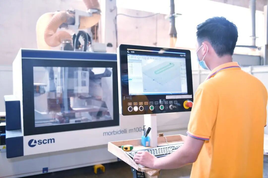 在整洁宽敞的联邦家私集团绿色制造园区的数字化示范车间里,不见灰尘,但见大型自动化智能设备和机器人高效运作的“身影”。近年来,联邦家私以智能制造、绿色制造掀起效率革命,成为家居行业数字化智能化转型标杆。走进联邦家私总部智能制造大数据中心,只见墙上挂满大型电子显示屏,能实时显示每条生产线、每个工序的生产状况以及产量、质量、耗能、耗电、耗水等数据,对生产过程进行动态可视化监管,为生产制造作业提供大数据支撑,从而提升生产设备利用率,降低生产过程能源消耗。