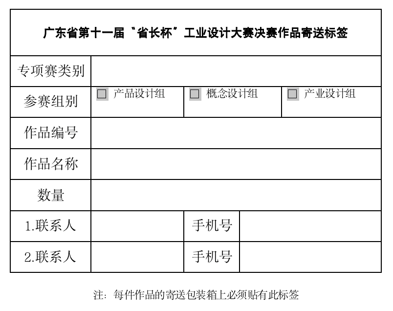 4.根据最新防疫要求,寄送包装箱上必须贴有“广东省第十一届‘省长杯’工业设计大赛决赛作品寄送标签”,才允许进入决赛场地。标签如下: