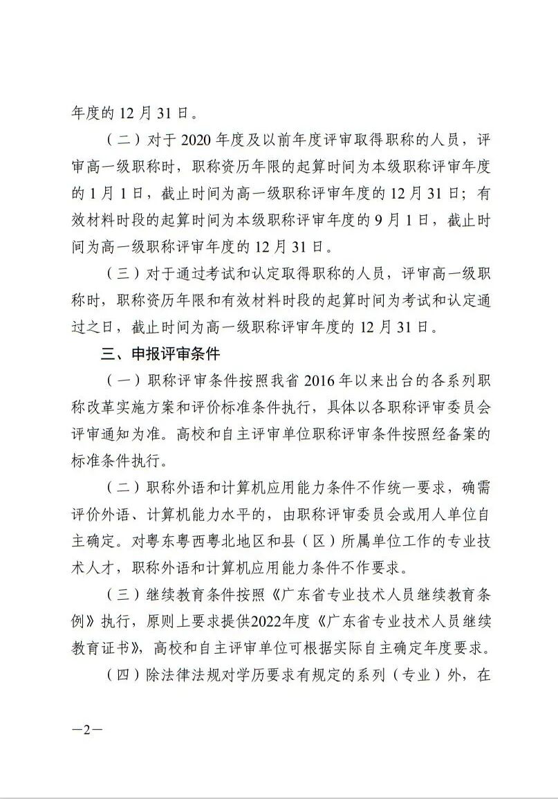 根据国家和省深化职称制度改革意见精神,以及《关于印发广东省职称评审管理服务实施办法及配套规定的通知》(粤人社规〔2020〕33号)等规定,2022年度全省各级职称评审委员会受理申报材料时间,原则上为2023年1月至3月,2023年6月底前完成评审。高校和自主评审单位的职称评审工作按照经备案的时间安排推进。