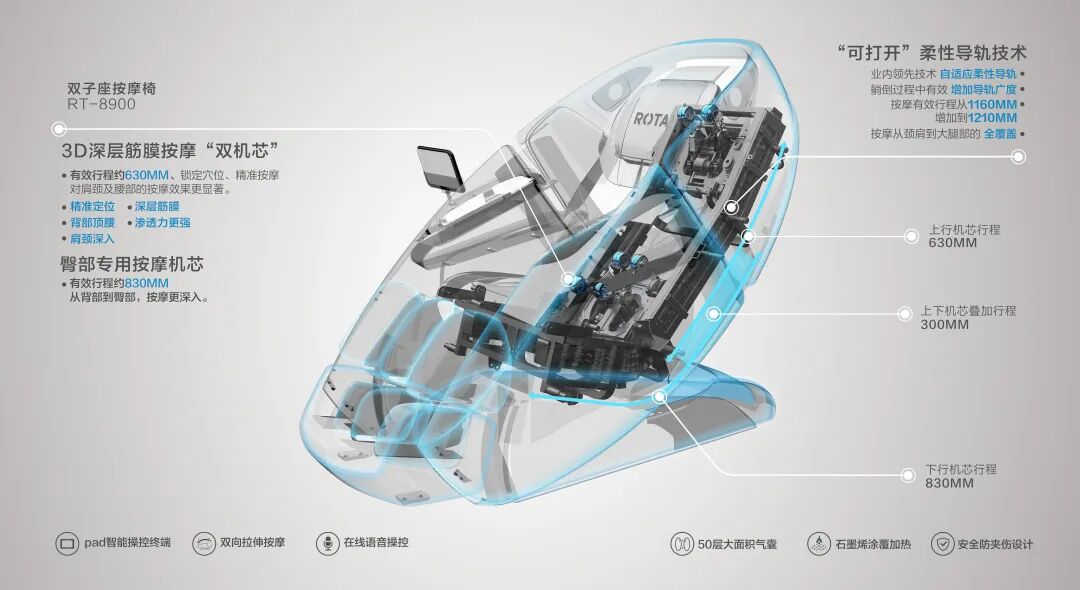 产品的品质与技术,才是一家公司的核心竞争力。任何时候任何形态下公司竞争的核心都是产品,此中创新尤为重要。可能很多人并没有意识到按摩椅的技术有多复杂,但与手机、家电等行业的发展一样,按摩椅行业的技术也已经经过了几轮迭代,如今包括智能语音控制、柔性导轨、加热等功能都已经实现了技术导入。
