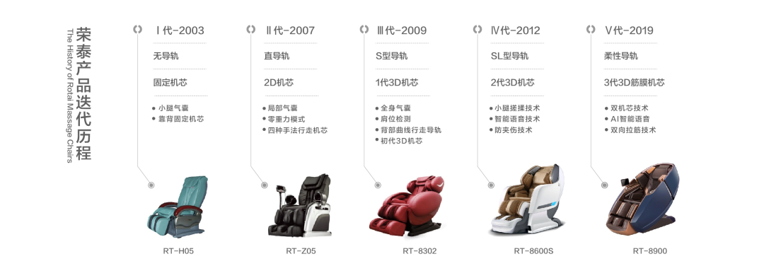 2000年以后,中国经济步入高速增长时期。结婚“三大件”也升级换代成了房子、车子和票子。生活更加讲究,对智能家电的需求更加强烈。按摩器具行业也至此得到了快速发展,随着业态的扩大,机械化工厂化批量生产,国内形成了按摩椅品牌丰富、型号众多的格局。荣泰也开始从无导轨的按摩垫,做到了直导轨的按摩椅,又从直导轨的按摩椅做到了L形导轨的按摩椅,到现在升级成人体工学SL导轨以及创新独有的柔性导轨,按摩器等小件产品也逐步完善,形成了如今种类丰富,清晰明朗的产品线格局。