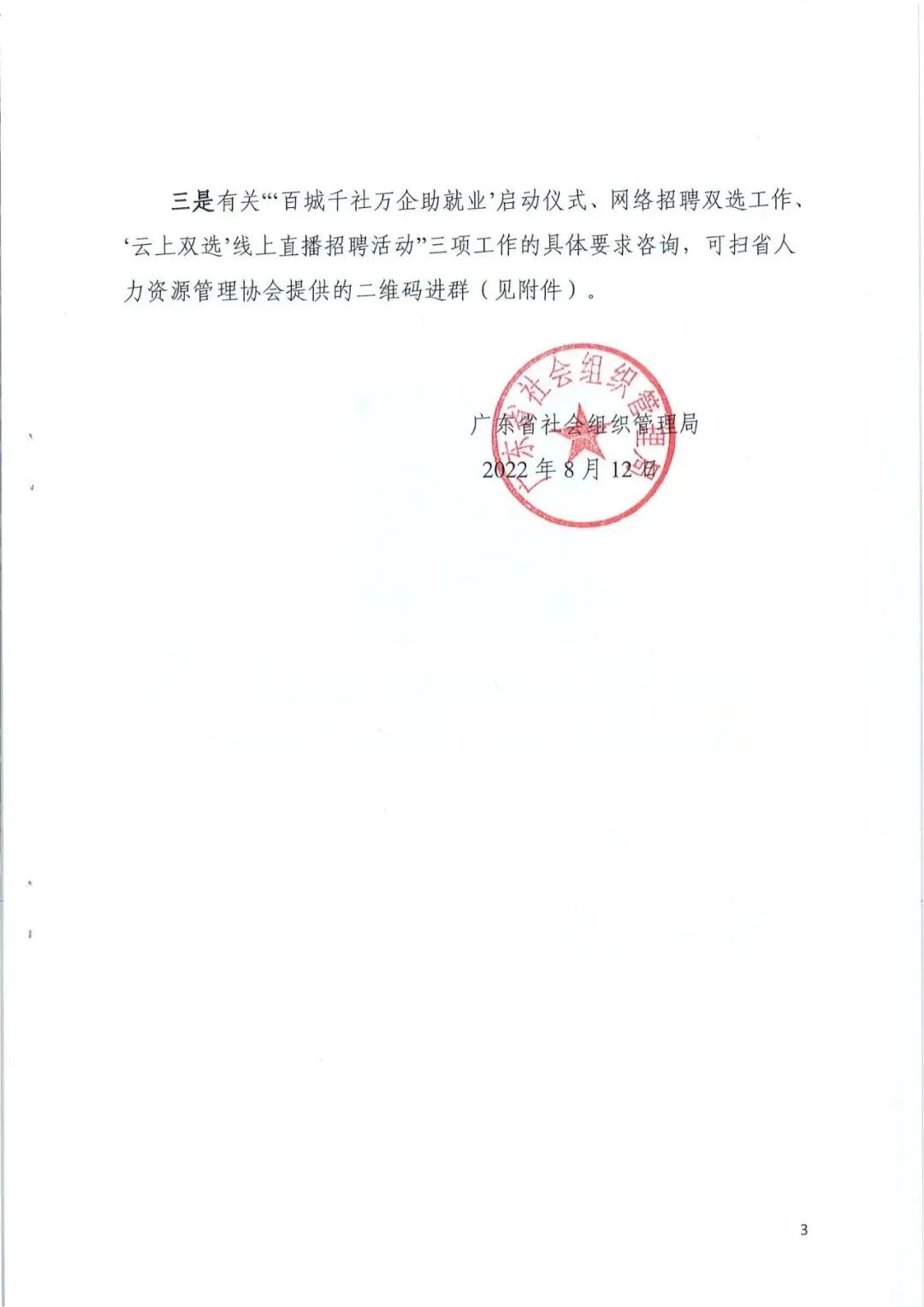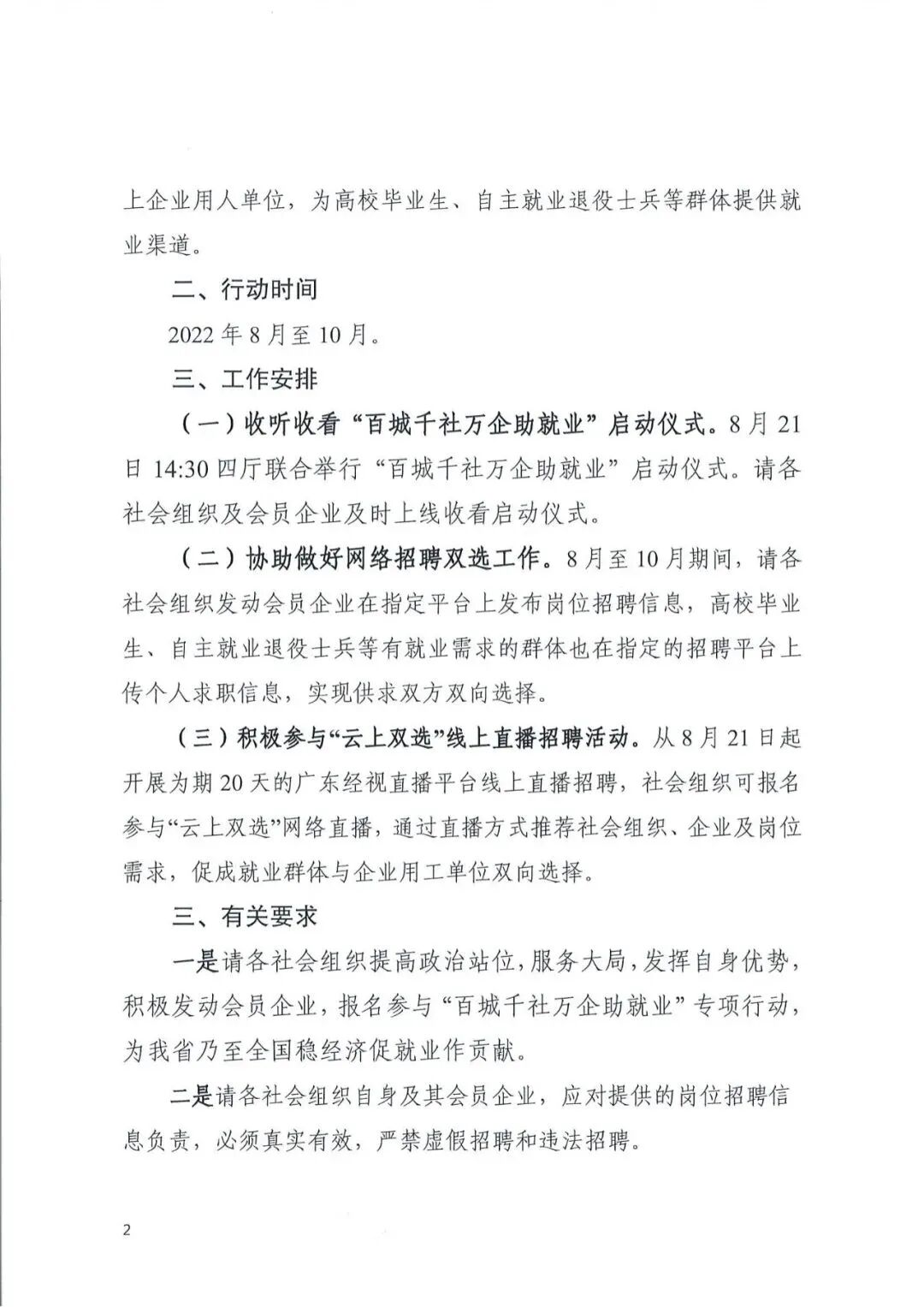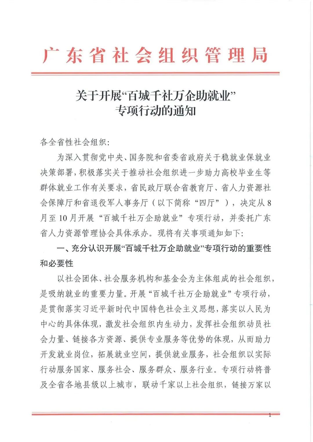 为深入贯彻党中央、国务院和省委省政府关于稳就业保就业决策部署,积极落实关于推动社会组织进一步助力高校毕业生等群体就业工作有关要求,省民政厅联合省教育厅、省人力资源社会保障厅和省退役军人事务厅(以下简称“四厅”),决定从8月至10月开展“百城千社万企助就业”专项行动,并委托广东省人力资源管理协会具体承办。