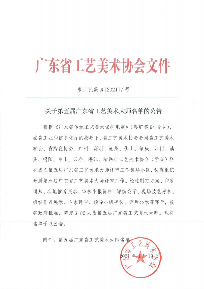 省委、省政府高度重视工艺美术行业发展,采取一系列有力措施保护与发展我省工艺美术产业,去年颁布了《广东省工艺美术保护和发展条例》,为进一步促进工艺美术保护和发展提供了明确的法律依据。近年来,我省工艺美术行业取得了长足发展,相继打造出一批产业集群和特色区域,专业人才持续涌现,截至目前共有中国工艺美术大师43名,广东省工艺美术大师377名。