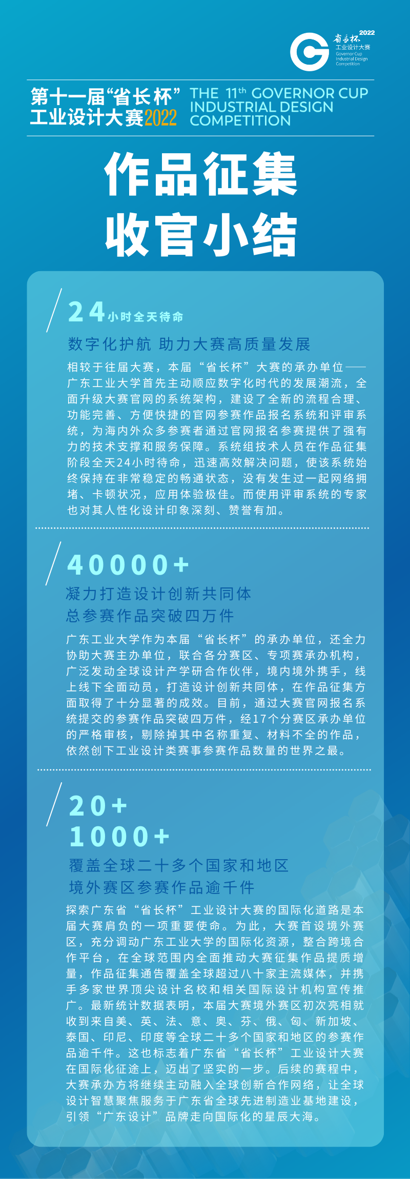 盛夏的热情意犹未尽,立秋已从容而至,悄然拉开收获的序幕。历经数月的宣传发动,广东省第十一届“省长杯”工业设计大赛作品征集工作已于8月初圆满收官,同时各分赛区的初赛评审工作也在有条不紊地进行中。这场备受国内外瞩目的广东省工业设计盛事,首次由高校承办就展现出前所未有的活力,参赛作品总量持续攀升,国际影响力不断扩大,一起来看看本届大赛作品征集都有哪些突破吧!