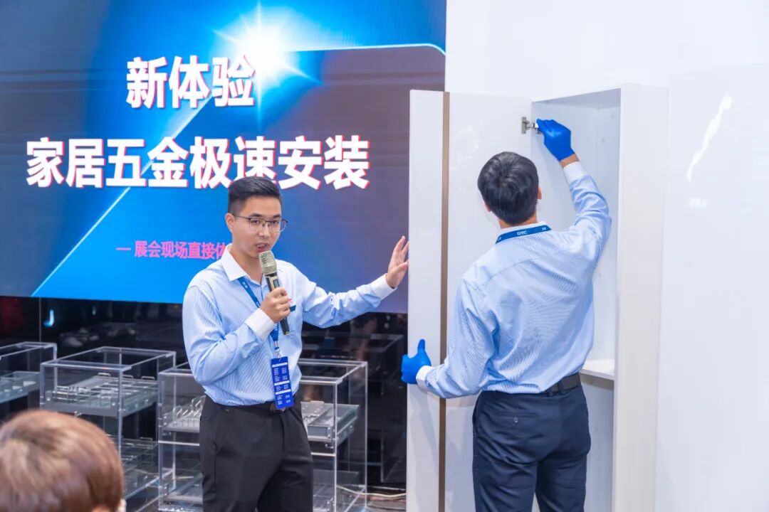 一扇牵涡轮调节任意扣卡式可调速阻尼铰,可通过平压、前卡、后卡三种安装方式,把本体卡扣在底座上。特别是任意扣应用于多个铰链的高柜安装门板时,可任意调整上下多个铰链扣底座的次序,极大提高安装高柜门板的效率,很好地解决高柜复杂安装的难题。展会现场客户体验了该功能,赞赏不已。