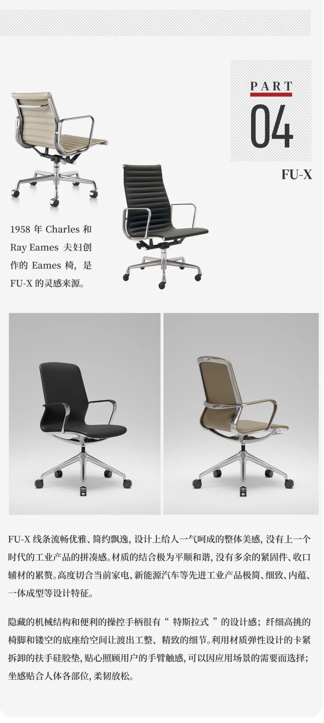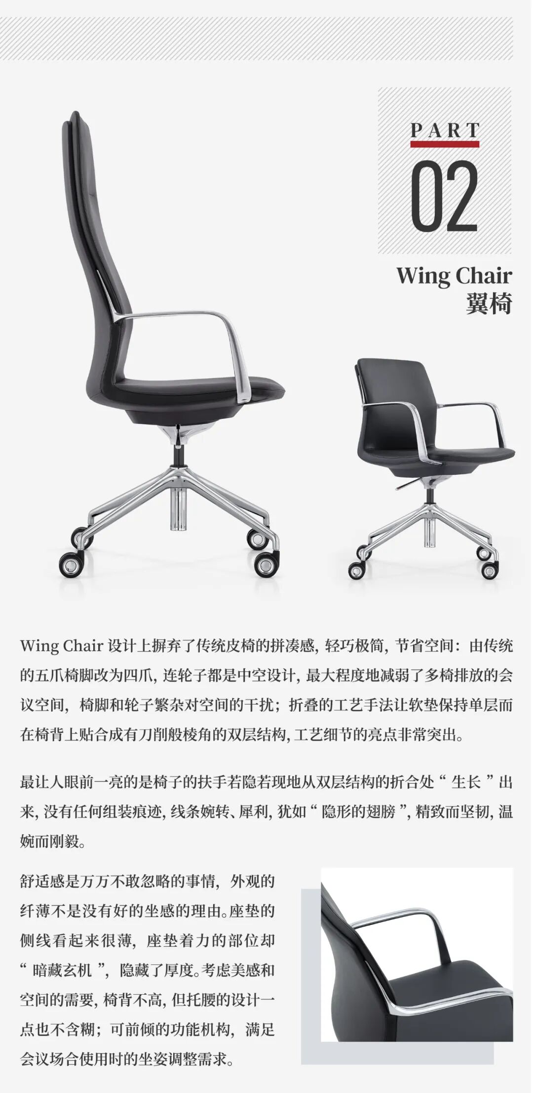 以“Wing Chair 翼椅”为例,它更多地考虑空间上的经济性。传统的皮椅一般采用较厚或者多层甚至多个软垫来强调它的舒适性和价值感,而这种传统的设计,与当前办公环境对轻松简洁、空间经济、现代明快、工艺质感等的设计要求不太匹配。