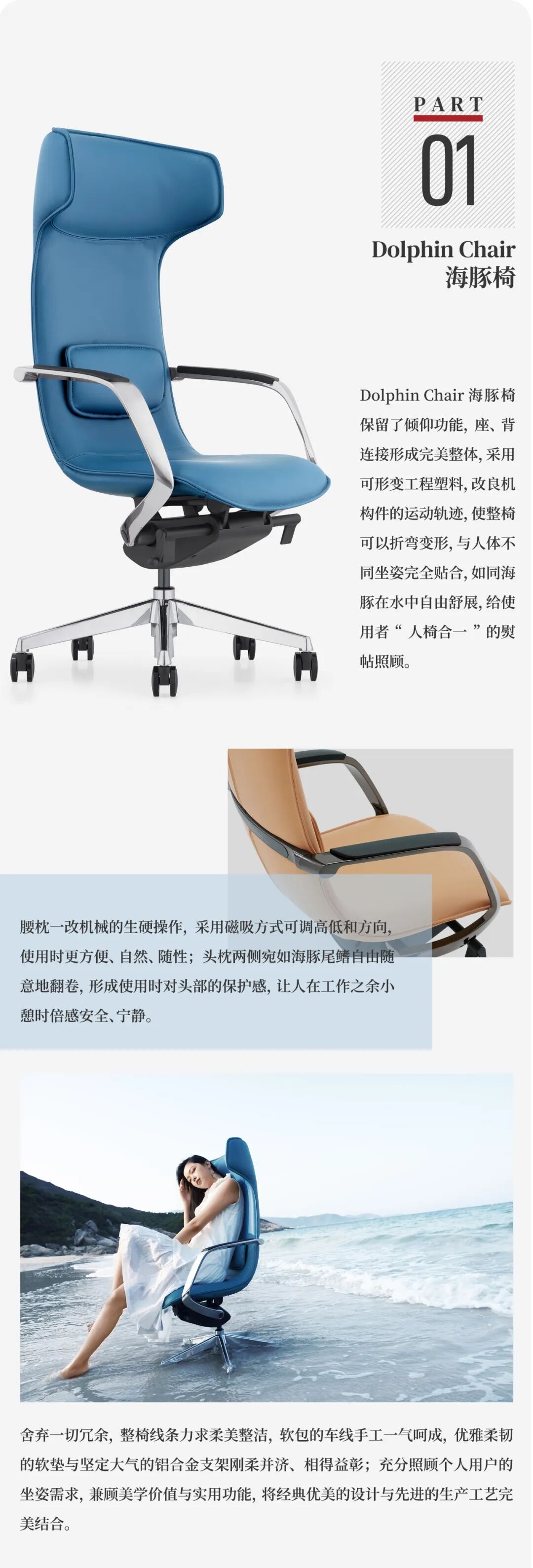 之前我们的办公椅大部分是椅背和椅座分离,使用时椅背后仰且椅座稍有角度的变化,整椅有明显的机械运动感,其活动曲线与人体的活动曲线没办法完全同步、平行。因此,我们去年就推出、今年还在继续主推的“Dolphin Chair海豚椅”,就是对遨游海洋般的自由的畅想,通过新结构和新材料的运用,提供用户使用全程多坐姿形态的支撑。