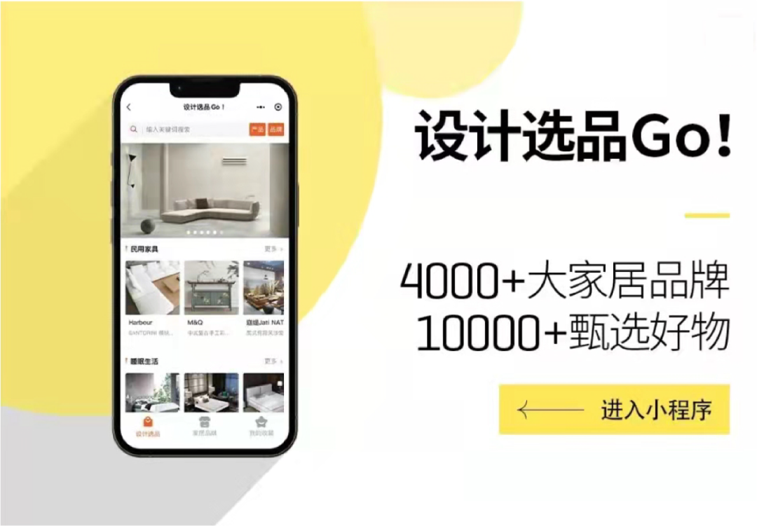 其中,“设计选品Go!”栏目涵盖民用家具、睡眠生活、饰品家纺、灯具灯饰、户外家具、办公家具、商用空间等七大品类,打造家居行业设计用材灵感库,是设计师们一站式选材的不二之选!