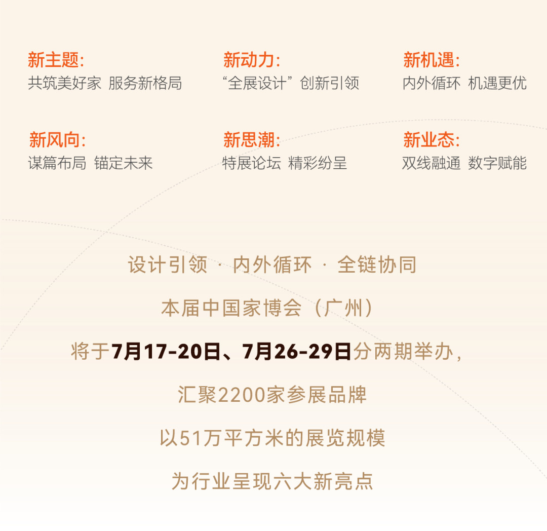 本届中国家博会(广州)以新主题为引,以全展设计为源动力,汇聚新机遇、新风向、新思潮、新活力,凭借高品质、超大规模、全题材、全产业链、全渠道的资源优势,为全行业打造一场安全、祥和、绿色、精彩、丰收的家居行业盛宴。7月17-20日、26-29日,相约广州琶洲,我们不见不散!