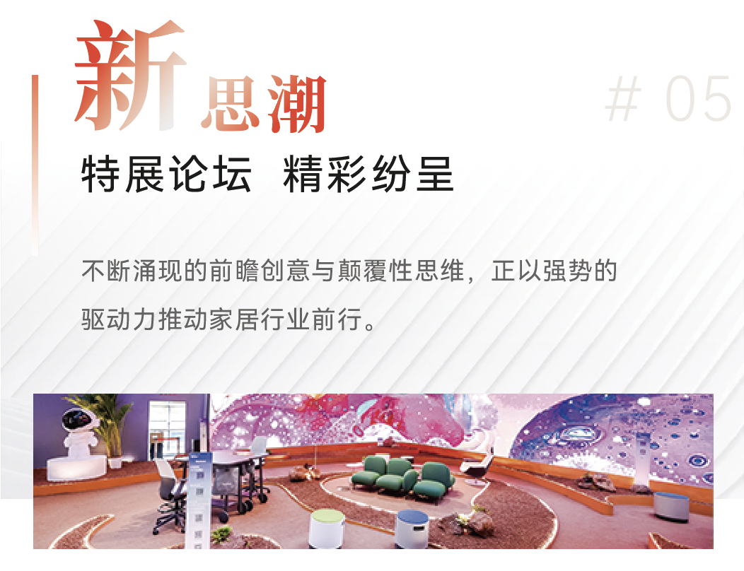 本届展会围绕趋势发布、设计展示、互动交流等方面重磅打造2030+国际未来办公方式展、CMF趋势LAB、DDS当代家居潮流观念展、D2M设计样、“年轻人日与夜”设计潮玩展、萤火虫博物馆儿童空间展、智能睡眠主题展、办公环境主题馆等8场主题特展。同时,展会期间举办2022全球家具行业趋势发布会、“设”交声量场设计师系列论坛、“经”英大讲堂经销商系列论坛、跨境电商系列论坛等超过80场会议论坛,为大家居行业健康发展建言献策搭建有效的高端对话平台,引领行业高质量发展新思潮。