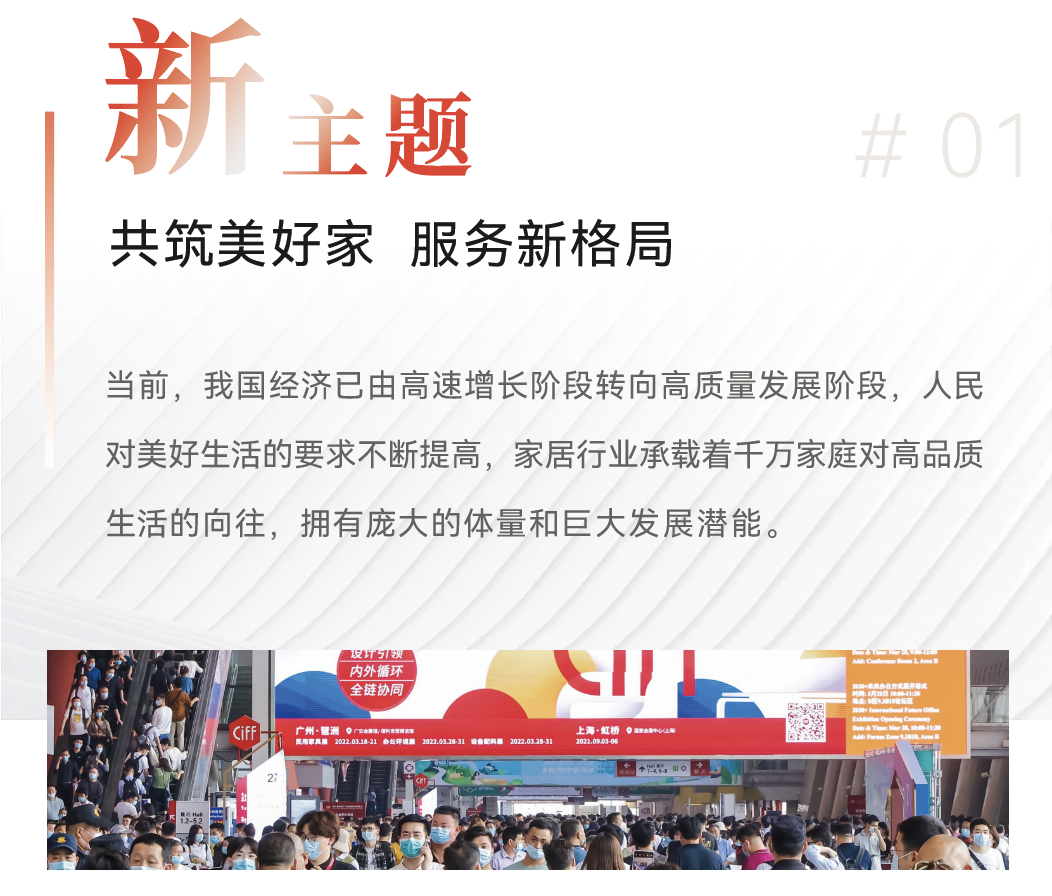 本届家博会以“共筑美好家、服务新格局”为主题,致力于进一步加强与行业的通力合作,共同服务构建大家居行业新发展格局。中国家博会是全球唯一以全产业链、全题材为鲜明特色的大家居博览会;是全球唯一实现设计渠道和贸易渠道、内销渠道和外贸渠道、传统渠道和新兴渠道全覆盖的大家居展会;更是唯一构建起3月广州、9月上海虹桥家博会,3月上海、7月广州和深圳建博会大范围全链协同的“连锁展会平台”。以三个“唯一”的独有优势服务构建新发展格局,既是大展担当,更是大有可为。