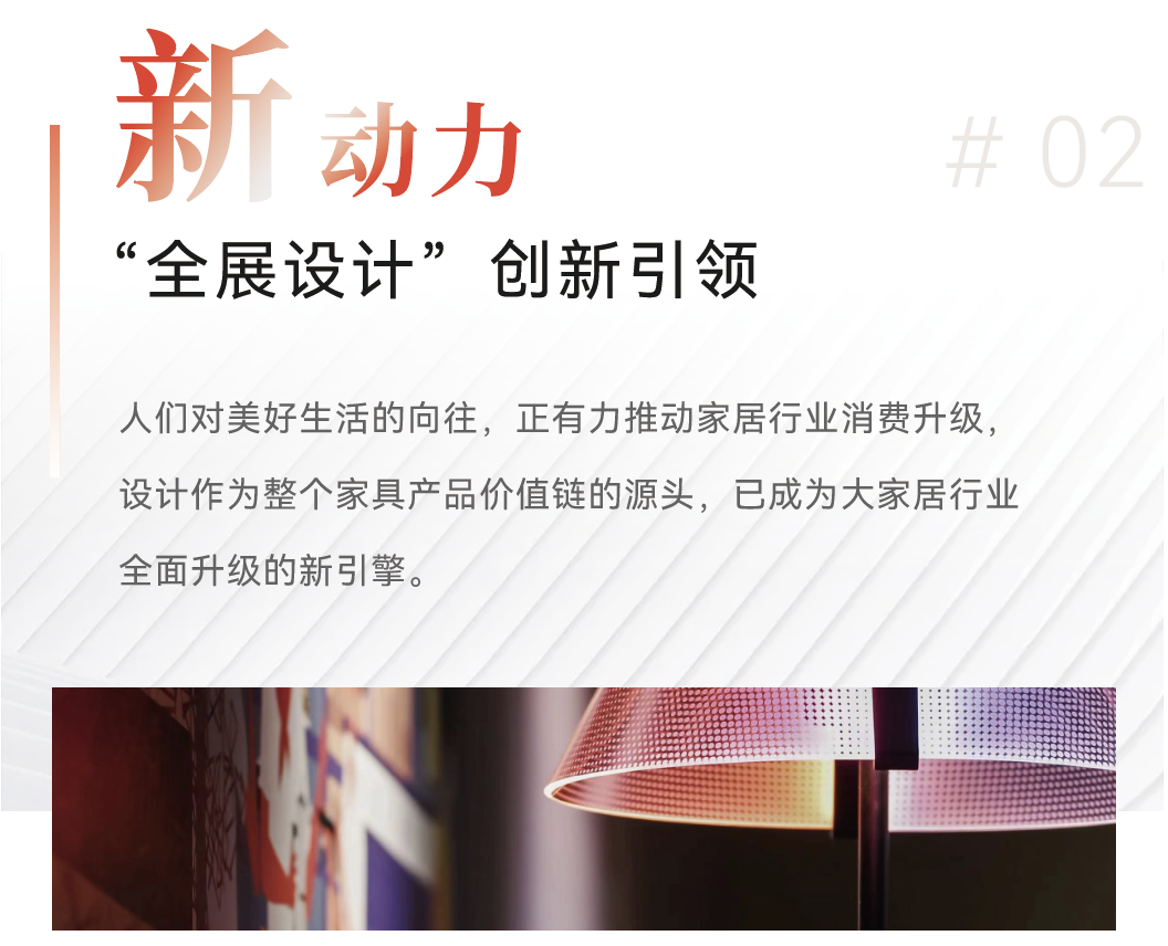 本届家博会倾力打造“全展设计”概念,三大品牌展呈现商业设计、全案设计、软装设计、休闲空间设计、办公环境设计、商用空间设计、材料美学设计等七大设计看点,设计参展阵容进一步加强,甚至超过了疫情前的高峰时期,为大家居行业的高质量发展注入创新思想和原创设计的驱动力。
