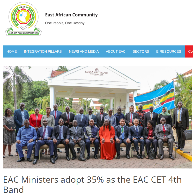 今年7月1日起,东非共同体正式实行第四档35%的共同对外关税(Common External Tariff,CET)的决定,计划纳入的商品包括:乳制品、肉产品、谷物、食用油、饮料和酒类、食糖及糖果、水果、坚果、咖啡、茶叶、鲜花、调味品、家具、皮革品、棉纺织品、服装、钢铁产品和陶瓷产品等。这里解释一下,东非共同体成员包括:肯尼亚、乌干达、坦桑尼亚、布隆迪、卢旺达、南苏丹和刚果民主共和国这7个东非国家。目前,东共体共同对外关税(CET)税率分三档,终端消费品25%、中间产品10%、原材料和资本货物0%。初衷是保护本地制造业免受廉价进口的竞争。东共体现任秘书长彼得·马图基(Peter Mathuki)称,这次实行35%的共同对外关税是朝着促进工业部门发展和实现非洲大陆自由贸易区(AfCFTA)利益最大化迈出的积极一步,此举将通过鼓励发展当地制造业以及提高产品附加值和工业化程度来刺激区域内贸易发展。当地媒体称,最高共同对外关税税率由25%提升至35%后,东共体区域内贸易收入将增加1890万美元,就业率提升0.03%,各成员国贸易收入增加5.5%。
