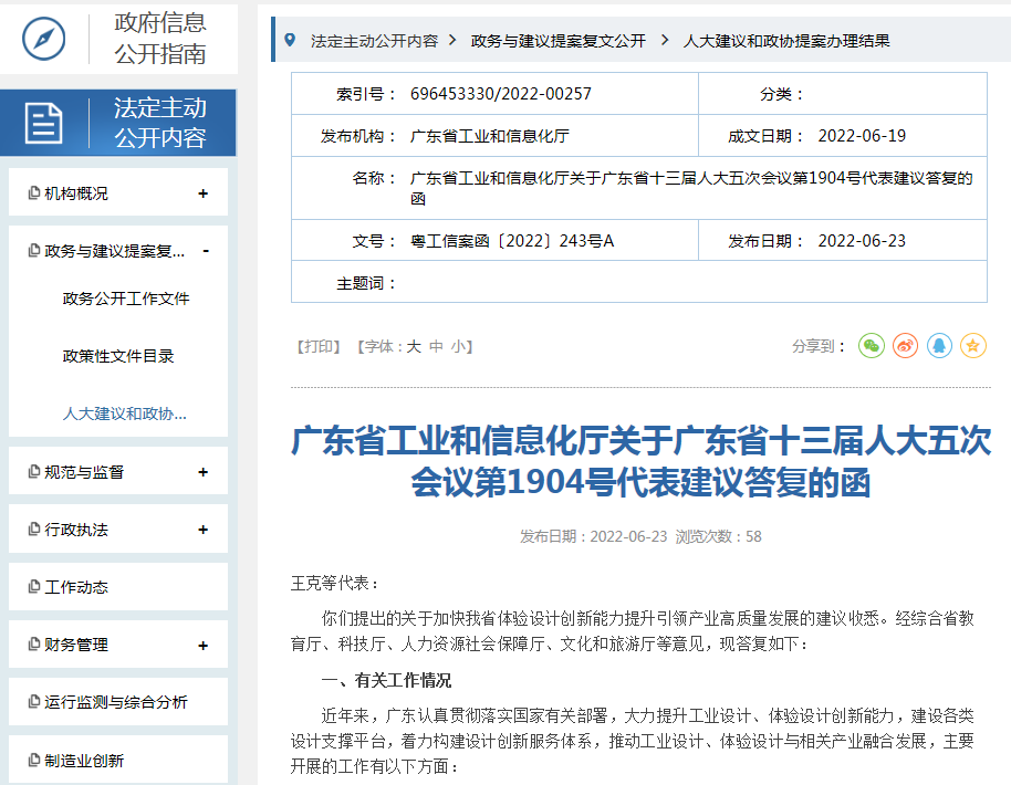《答复函》表示,近年来,广东认真贯彻落实国家有关部署,大力提升工业设计、体验设计创新能力,建设各类设计支撑平台,着力构建设计创新服务体系,推动工业设计、体验设计与相关产业融合发展,主要开展的工作有以下方面:建立完善政策体系,培育和支持各类设计主体发展,加强设计基础研究和公共服务,大力推动文化和科技融合发展,培育高端制造业设计人才等。
