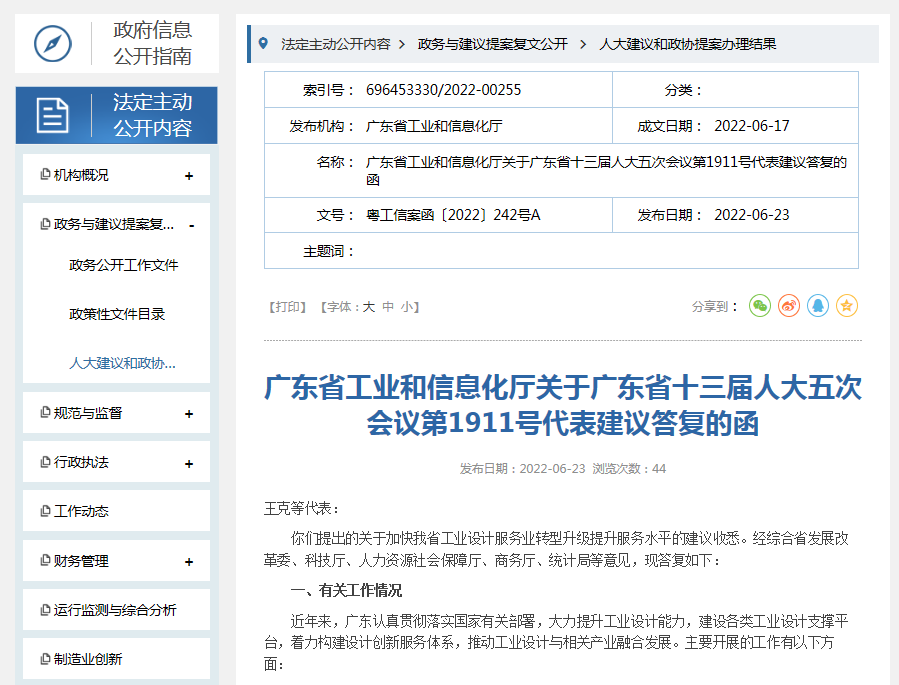《答复函》表示,近年来,广东认真贯彻落实国家有关部署,大力提升工业设计能力,建设各类工业设计支撑平台,着力构建设计创新服务体系,推动工业设计与相关产业融合发展。主要开展的工作有以下方面:建立完善政策体系,培育壮大设计主体,加强工业设计基础研究,构建工业设计服务网络,培育高端制造业设计人才,