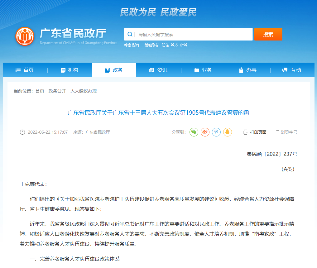 《答复函》表示,近年来,我省各级民政部门深入贯彻习近平总书记对广东工作的重要讲话和对民政工作、养老服务工作的重要指示批示精神,积极适应人口老龄化快速发展对养老服务人才的需求,不断完善政策制度,健全人才培养机制,助推“南粤家政”工程,着力推动养老服务人才队伍建设,持续提升服务质量。主要体现在:完善养老服务人才队伍建设政策体系,促进养老服务人才队伍高质量发展,健全医养结合保障机制,强化养老服务综合监管等方面。