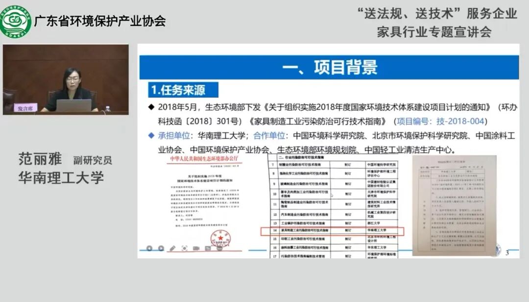 6月17日,由省生态环境厅主办的 “送法规、送技术”服务企业家具行业专题宣讲活动在佛山市举行,采取线上线下相结合的形式。此次宣讲会:一是落实做好广东省政府“十件民生实事”,提升家具行业污染防治技术水平;二是强化企业主体责任,助力我省深入打好污染防治攻坚战。作为协办单位之一,广东家协组织会员企业积极参加本次专题宣讲。