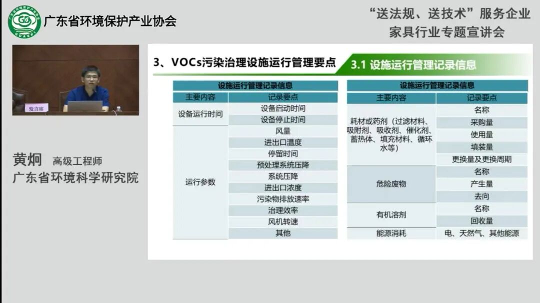 省环境科学研究员高级工程师黄炯分享了家具行业挥发性有机物(VOCs)污染治理设施运行管理要点及典型案例,主要从VOCs污染防治要求、家具行业VOCs治理技术、VOCs污染治理设施运行管理要点、典型案例四个方面进行介绍。