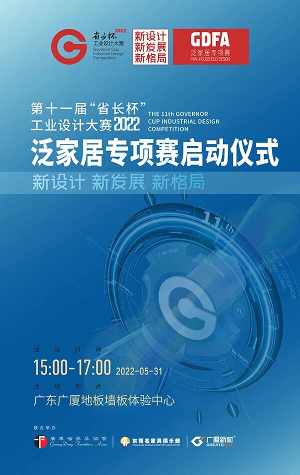 由广东家协、名家具俱乐部、广厦新材联合举办的2022年第十一届“省长杯”工业设计大赛泛家居专项赛启动仪式和宣讲活动,将于5月31日下午,在东莞广厦新材产品体验中心举行。精彩内容敬请留意主办机构及相关媒体报道。