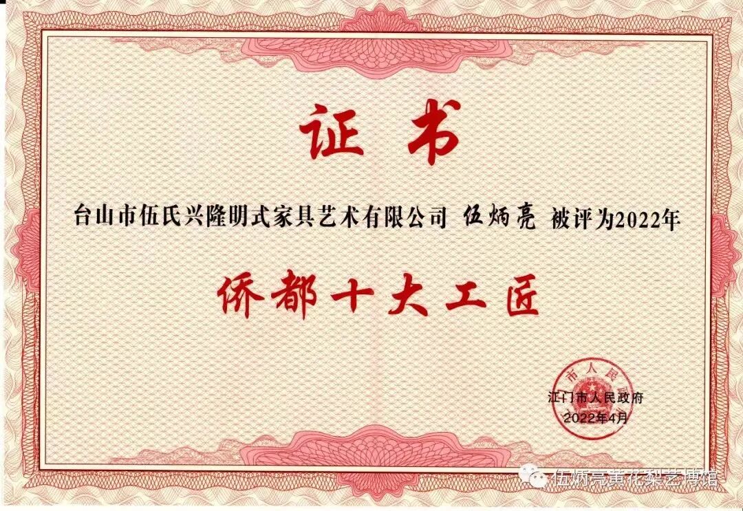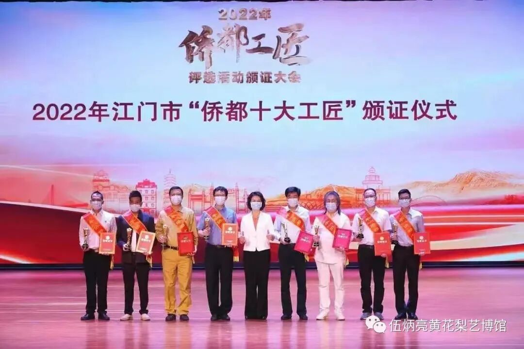 2022年,江门市实施《江门市“侨都工匠”评选和扶持办法》,计划选出“侨都十大工匠”和“侨都百优工匠”。2022年,江门市积极组织实施江门市第一届“侨都工匠”评选活动,全市技术技能人才踊跃参与,最终评选出“侨都十大工匠”9名,台山市伍氏兴隆明式家具艺术有限公司伍炳亮位居其中;评选出“侨都百优工匠”95名,台山市俊辉红木艺术有限公司谢俊有、新会区森木古典家具有限公司蒋华侨、江海区梁氏木雕工艺文化馆梁群英等三人榜上有名,可喜可贺。三类工匠覆盖制造业、文旅、能源、农业等多个领域,这次江门市委、市政府高规格举办2022年“侨都工匠”评选活动颁证大会,助推“中国制造”迈向“中国创造”,为奋力推动构建新时代侨都高质量发展新格局作出新的更大贡献!