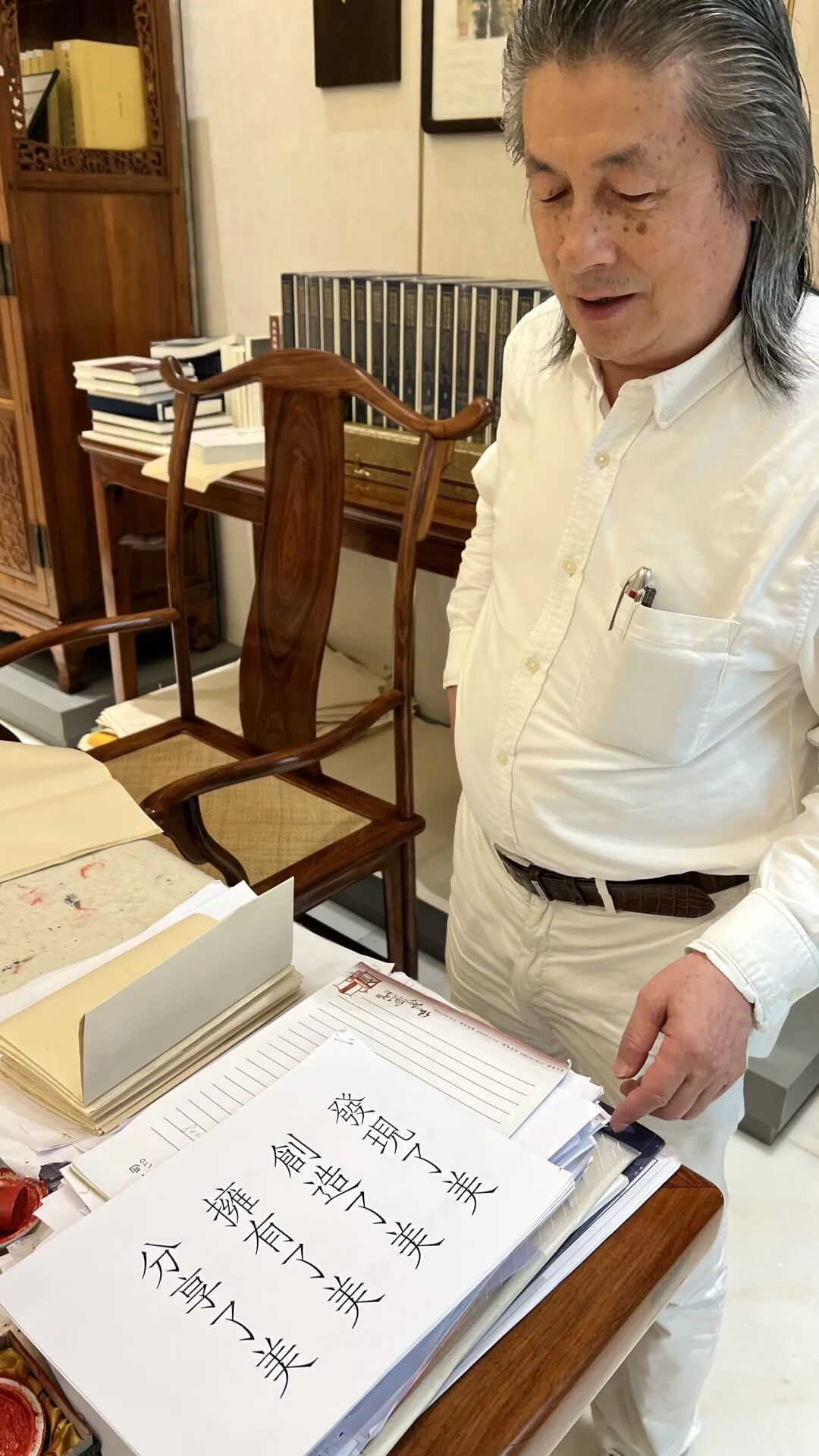 王会长对伍大师获评首届“侨都十大工匠”表示祝贺,对伍大师取得的成就表示赞赏。他指出,伍炳亮先生从一个普普通通的红木家具人成长为行业大师绝非偶然,从业43年,就是不断从“发现美——创造美——拥有美——分享美”的蜕变和演绎过程,自从伍大师提出以“型、艺、材、韵”为准则的传统家具评鉴和制作指导理论,伴随审美标准逐步形成和实践完善,大大推进了红木家具传统文化的传承、创新、发扬、光大进程,其众多作品以“型精韵深、材艺双美”的艺术特点,受到资深专家、学者以及收藏家的赞誉和喜爱。