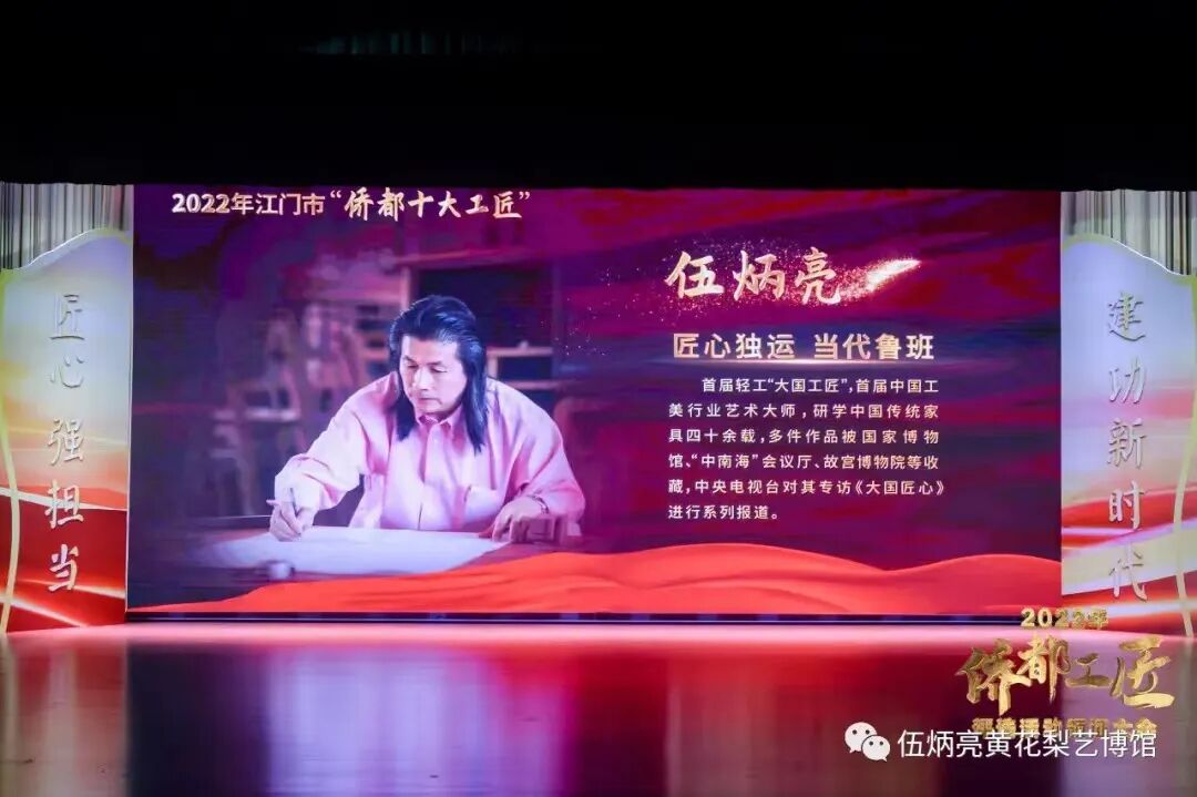 在首届“侨都十大工匠”颁奖仪式上,江门市政府给予伍炳亮先生这样的高度评价:“伍炳亮——匠心独运、当代鲁班。台山市伍氏兴隆明式家具艺术有限公司董事长、艺术总监、第一届轻工“大国工匠”、第一届中国工美行业艺术大师、正高级工艺美术师、国家技能大师工作室领衔人、伍炳亮大师传承创新基地领衔人、省级非物质文化遗产项目广式硬木家具制作技艺代表性传承人等称号,伍炳亮研学中国传统家具四十余载,多件作品分别被中国国家博物馆、“中南海”会议厅、北京故宫博物院、恭王府等收藏;取得6项实用新型专利,30项外观专利;伍炳亮于2008年编著由人民美术出版社出版的《伍炳亮作品珍赏》受到行业、学术界热烈反响,其第二部编著由文物出版社出版的《伍炳亮作品撷珍:海南黄花梨之美》也即将发行,同时伍炳亮口述参与编制《中国古典家具制作技艺传承人口述史-伍炳亮》,受邀担任故宫出版社出版的《故宫博物院藏明清家具全集》副主编等,国内外多家媒体争相报道,其中“CCTV发现之旅”对伍炳亮的专访《大国匠心》进行系列报道、凤凰卫视“文化大观园”等专题报道。由其个人出资设计兴建的“伍炳亮黄花梨艺博馆”于2018年对外开放,该馆占地36000多平方米,以此科普传统家具知识及展示其所设计制作的1300多款古典家具,开放至今已接待超20万人次,对推动传统家具文化发挥积极作用。”