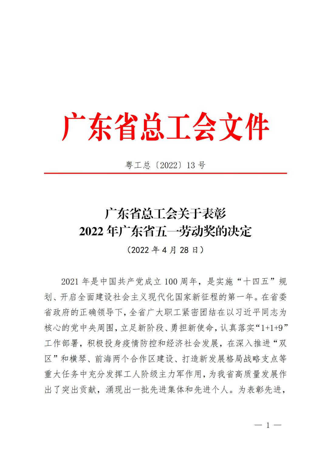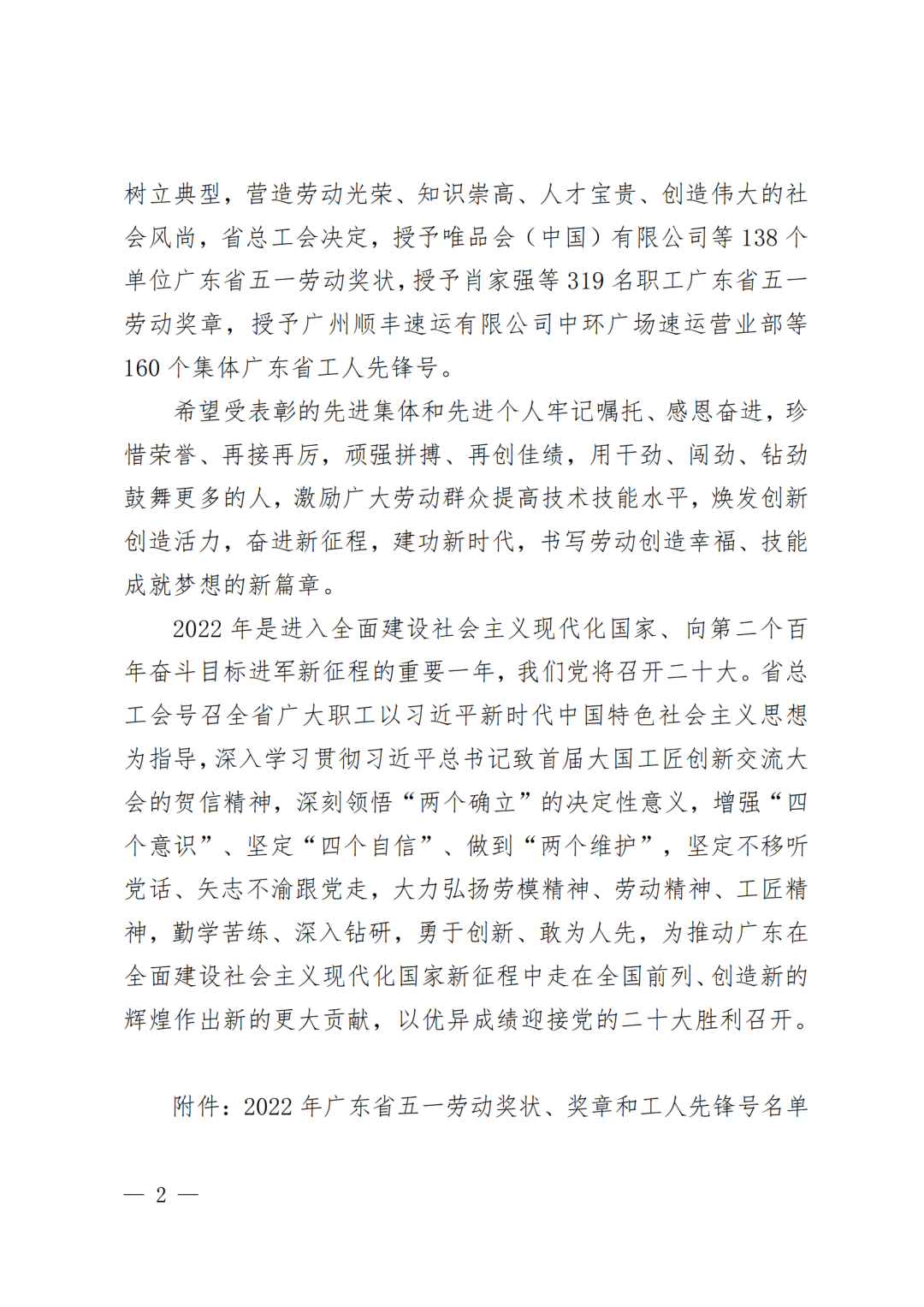 表彰决定指出,2022 年是进入全面建设社会主义现代化国家、向第二个百 年奋斗目标进军新征程的重要一年,我们党将召开二十大。省总工会号召全省广大职工以习近平新时代中国特色社会主义思想为指导,深入学习贯彻习近平总书记致首届大国工匠创新交流大会的贺信精神,深刻领悟“两个确立”的决定性意义,增强“四个意识”、坚定“四个自信”、做到“两个维护”,坚定不移听党话、矢志不渝跟党走,大力弘扬劳模精神、劳动精神、工匠精神,勤学苦练、深入钻研,勇于创新、敢为人先,为推动广东在全面建设社会主义现代化国家新征程中走在全国前列、创造新的辉煌作出新的更大贡献,以优异成绩迎接党的二十大胜利召开。