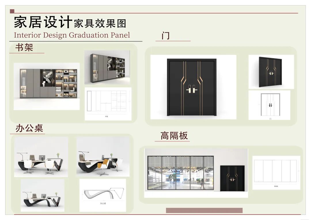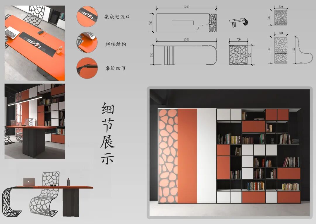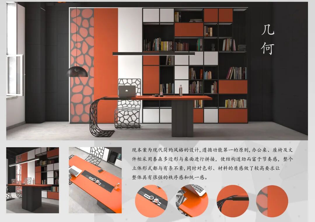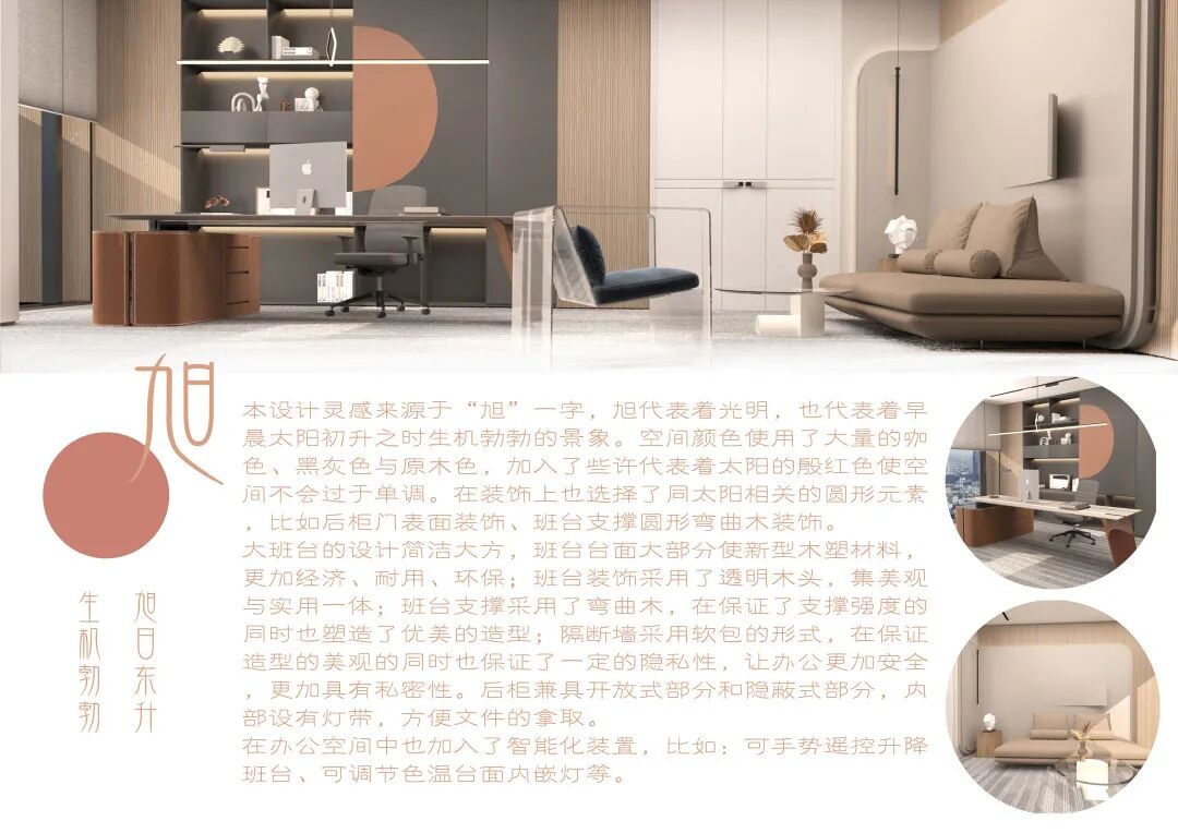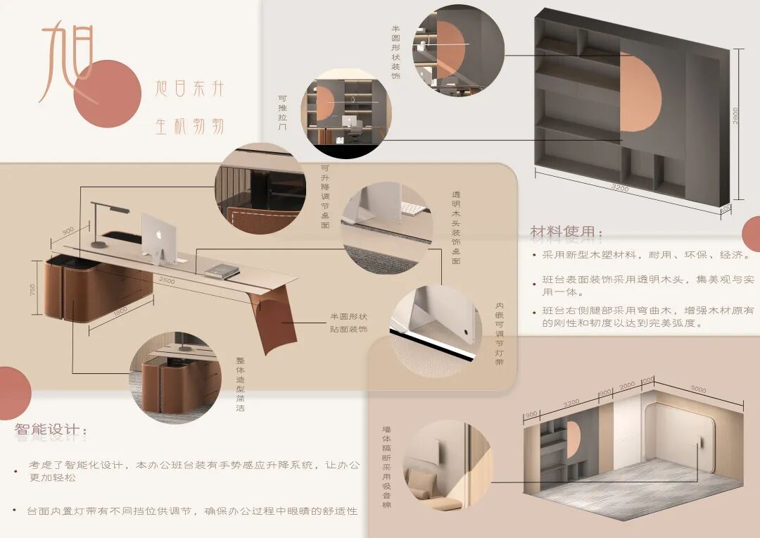 点评:本办公家具设计作品以汉字“旭”作为创意灵感,巧妙地把大班台与文件柜书架进行组合设计,把太阳的圆形元素与殷红色彩融入家具造型设计之中,与此同时嵌入了智能化装置:可手势遥控升降班台、可调节色温台面内嵌灯等。在材料工艺上使用新型木塑材料与弯曲木,集美观与实用一体。