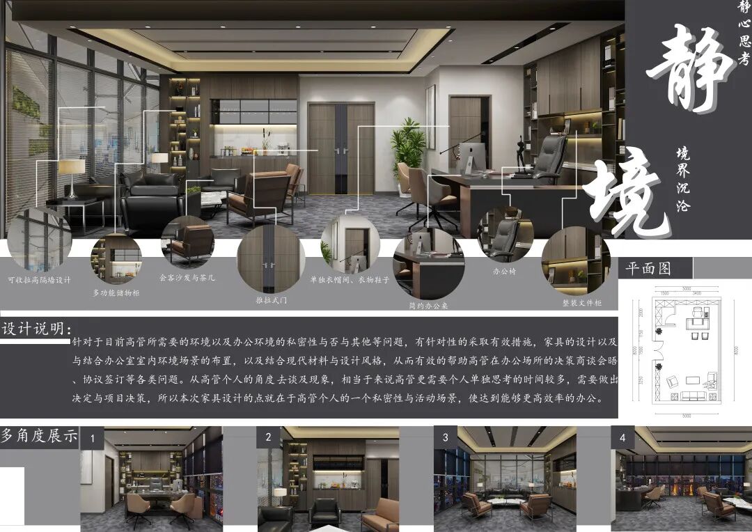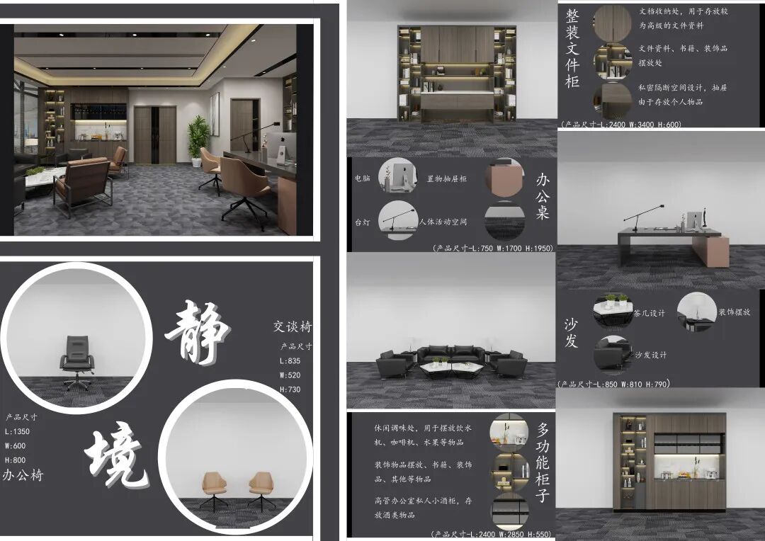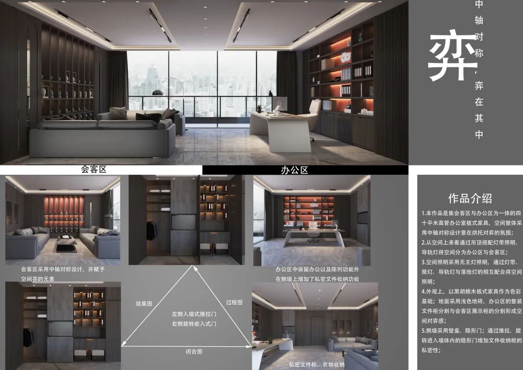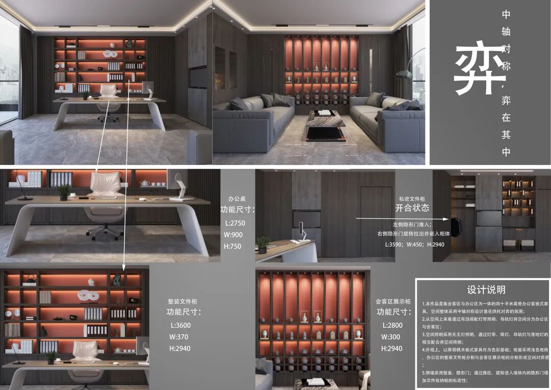 点评:此设计作品较为完美的体现了大赛设计主题:高管私密办公空间家具设计,在一个40平米的办公室空间中,基于未来办公空间的功能需求,以新生代企业家的审美观念设计打造了一个功能完整又赋予创意美感的系统办公家具。来源于大海波浪灵感的高低起伏办公桌,寓意节节高的书架与文件柜,黑白灰主色调与黄橙色彩的点缀,庄重大方又富有灵性。