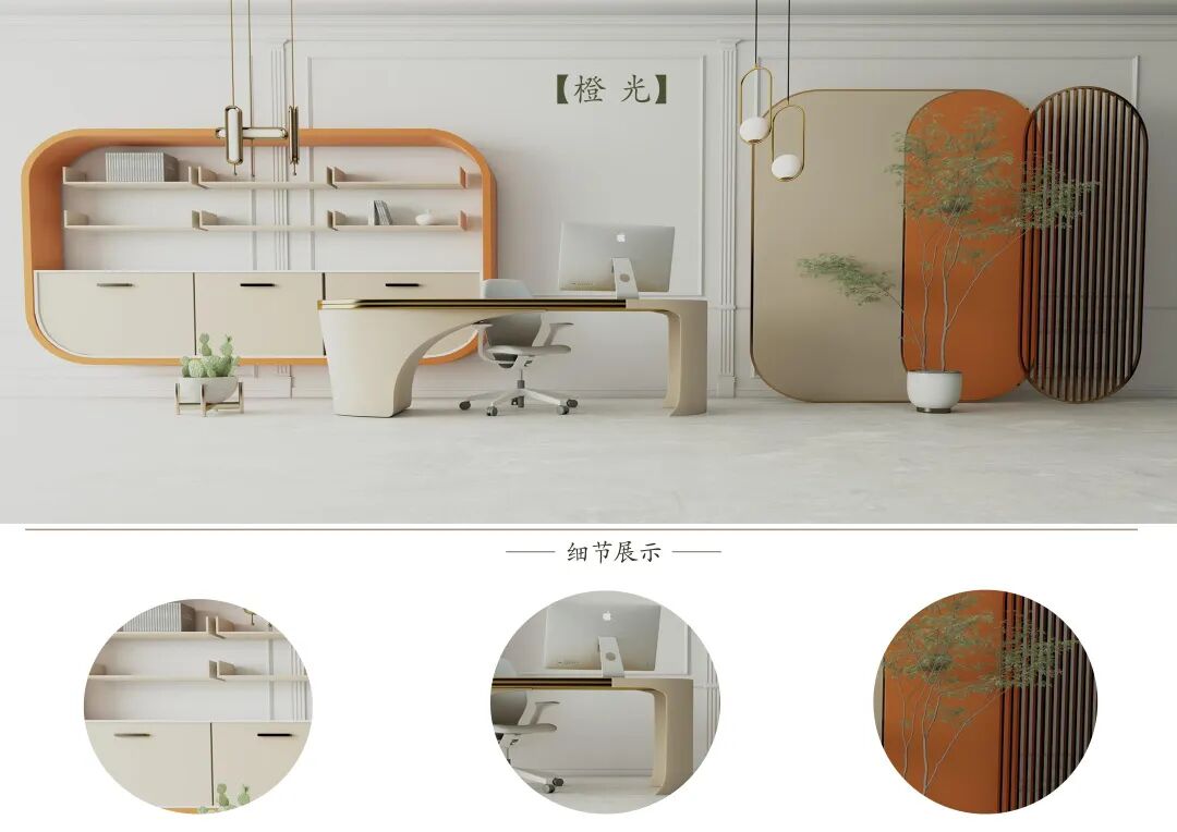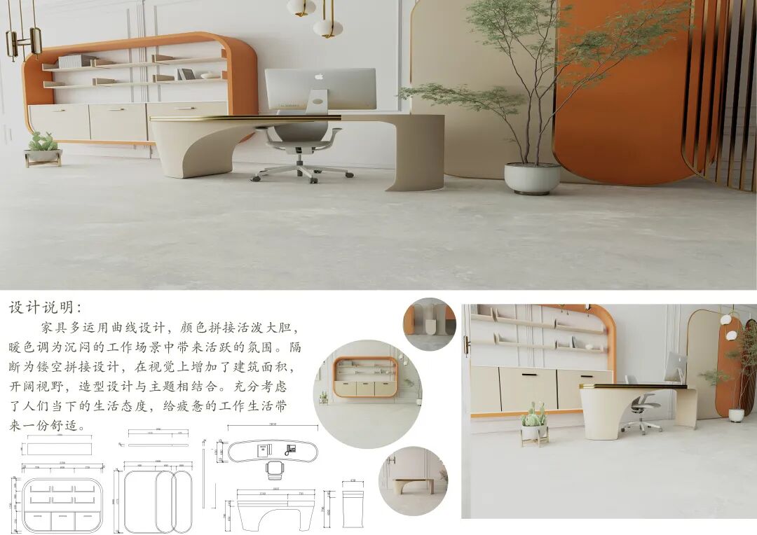 点评:本设计作品在整体造型上运用曲线与直线的方圆结合,白色基调与暖橙色结合活泼大胆,镂空拼接的隔断屏风设计,构成灵活多变的办公空间,打破了传统办公空间的单调与沉闷,符合数字化时代柔性化办公家具设计的潮流与趋势。