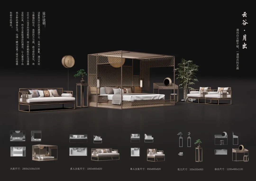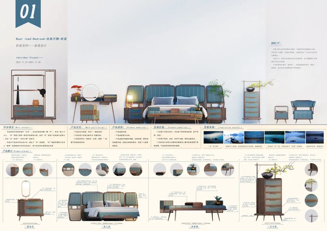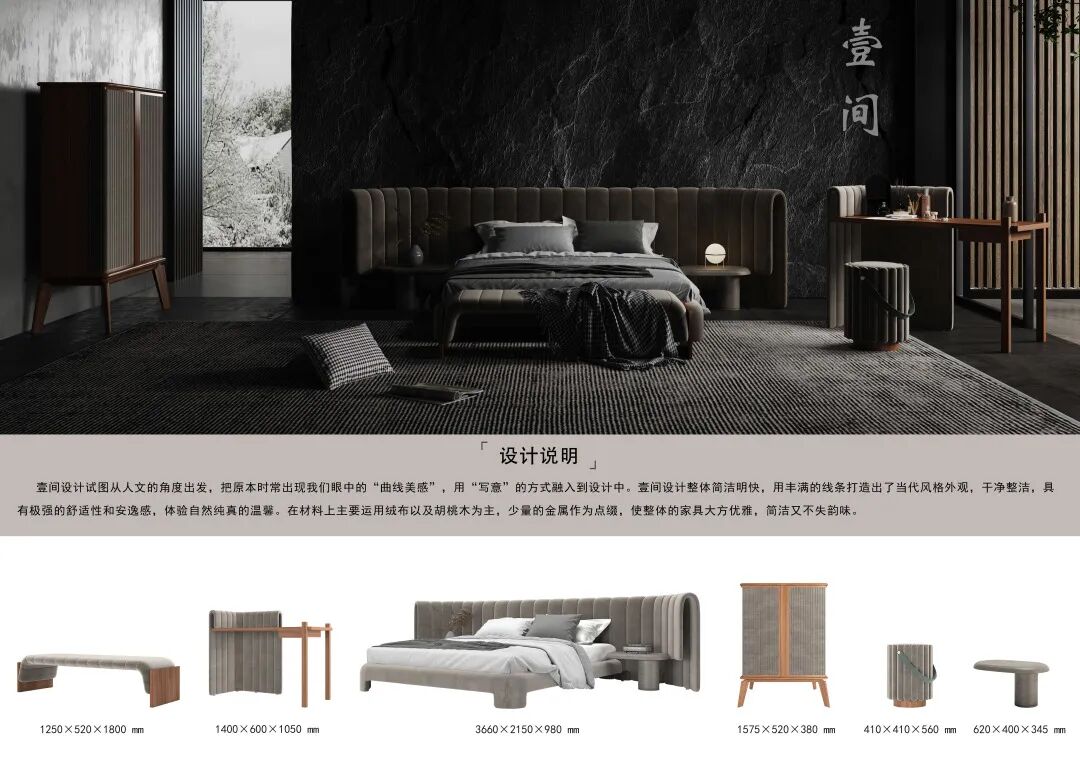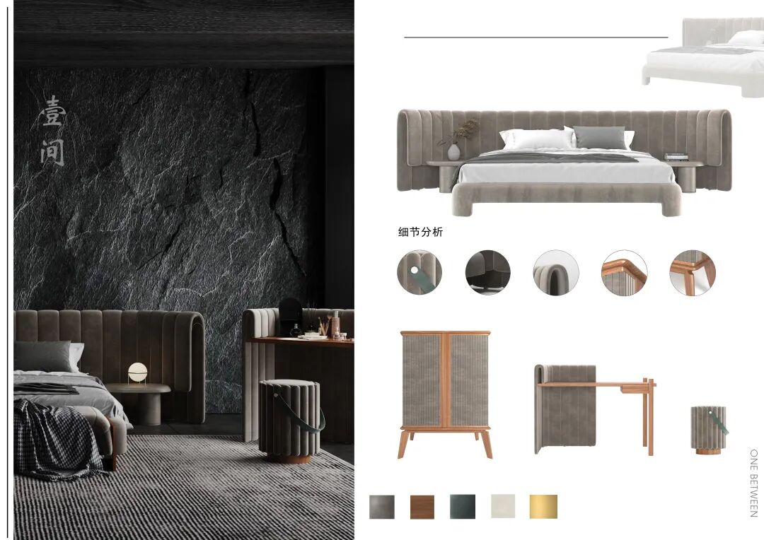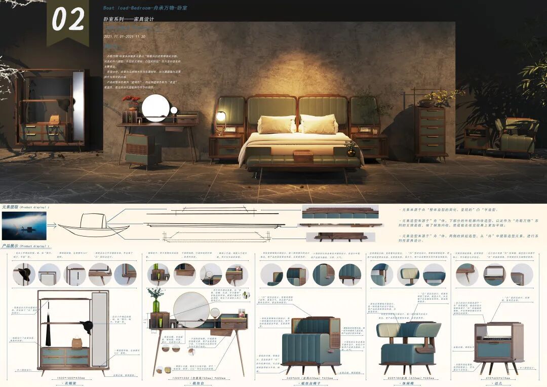 点评:作品以舟为概念,结合东方人文运用现代艺术进行创新,在材料上大胆引用墨绿色皮结合实木,犹如接纳自然的质朴与张力,用未来人居,拥抱过去历史传承与创新来打造不一样的酒店家具风格,设计者对作品的呈现是非常完整的,从出发点到设计到落地细节都呈现得非常清晰,是一套很有想法的产品。