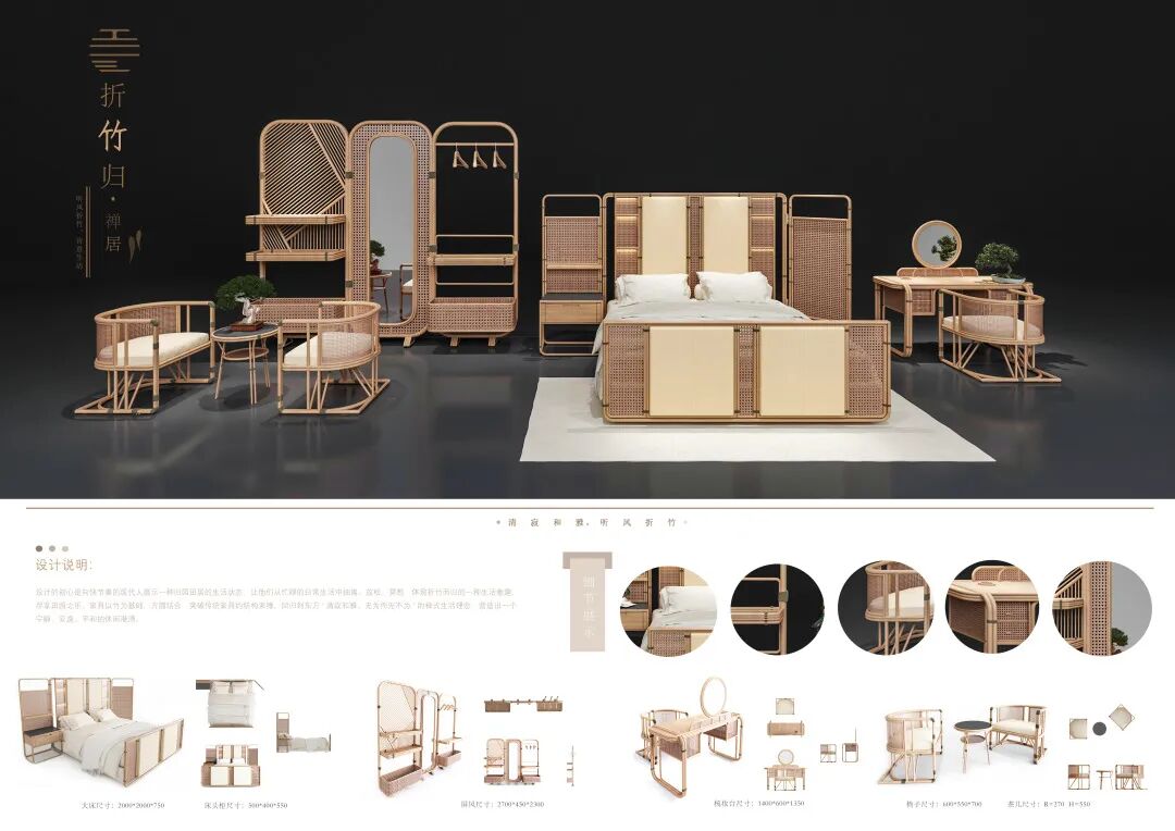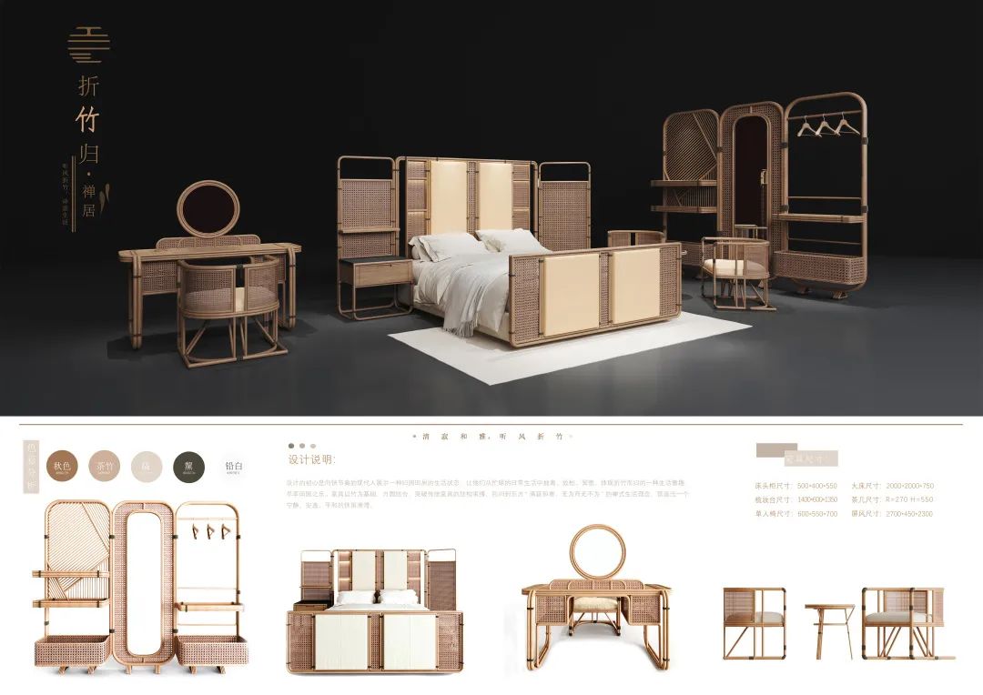 点评:以模块化形式出现的竹家具设计很适合现代竹藤产品的加工方式,整体结构符合竹家具的特点,竹藤捆绑的设计手法既是结构本身又是装饰的手法。作品整体风格简洁,设计完整度较高,设计手法克制,将几何元素与传统元素结合,全套作品气势流畅,新中式的气场较强,格调雅致,很合适五星级酒店套房主题。设计具有OttoWagner和Josef Hoffmann椅子设计的影子。在作品命名上有意味的形式可以更强点,换气整体空间的意境共鸣,同时设计还可以继续打磨,家具设计细节能处理的更到位一些,成熟度更高。
