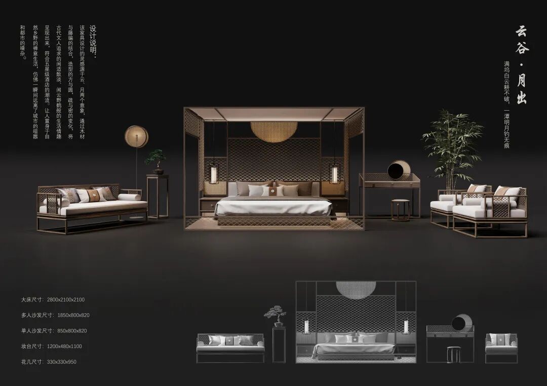 点评:作品方圆结合,通过云形线条的反复重复形成有力的视觉符号与藤编的原型外轮廓分割交融,形成明确的造型语言。拔步床以强烈几何手法营造的视觉形象聚拢了空间气场,矩形中的变化宁静、舒适,形成了新中式的审美意境,同时营造了静谧的休息氛围,立象以尽意。非常讨巧的以形式感博得了五星级酒店的整体场景氛围,这种形式非常合适五星级酒店客房布置的各种节庆日的软装氛围营造。