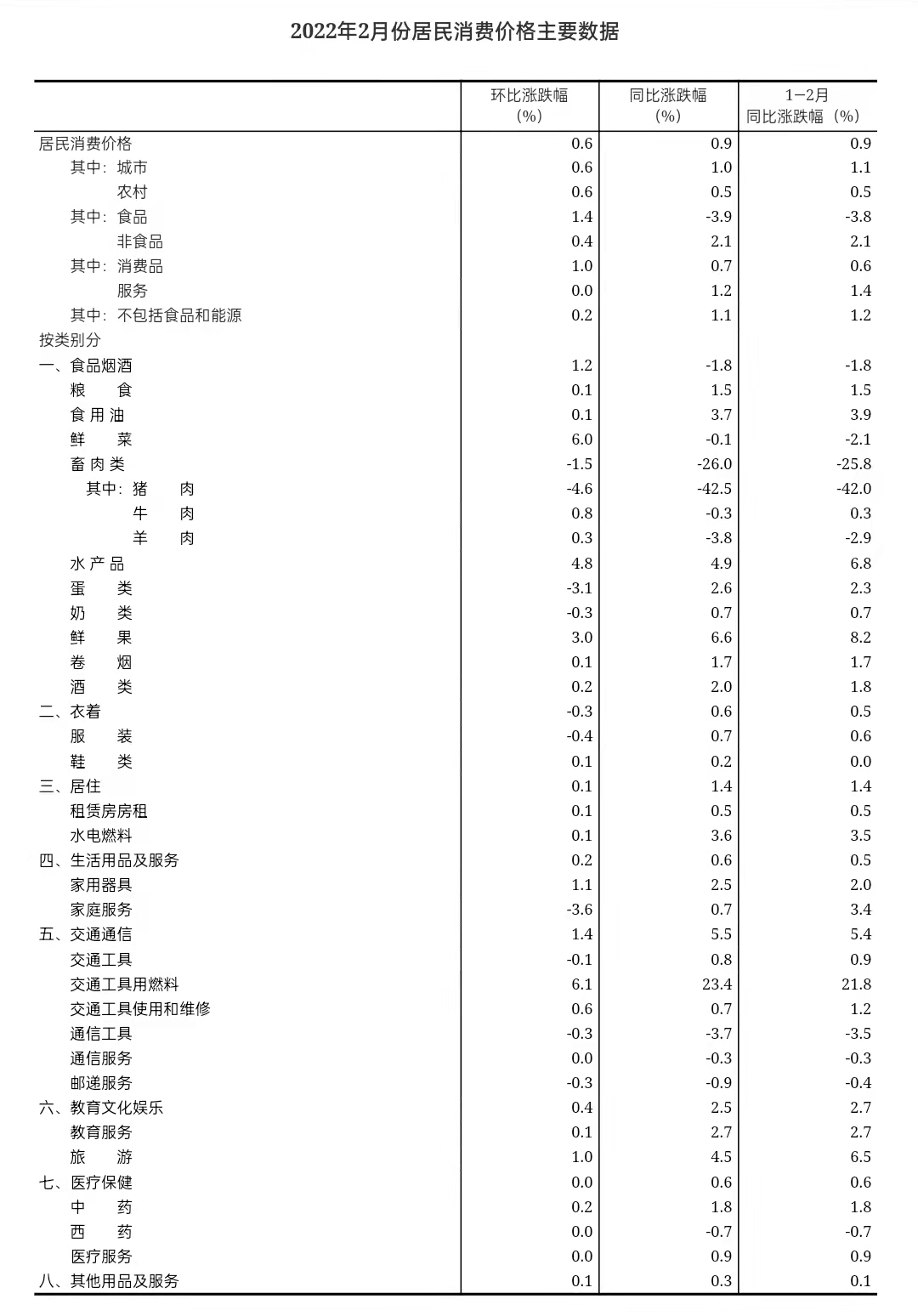 【经济资讯】2022年2月份居民消费价格同比上涨0.9% 环比上涨0.6%