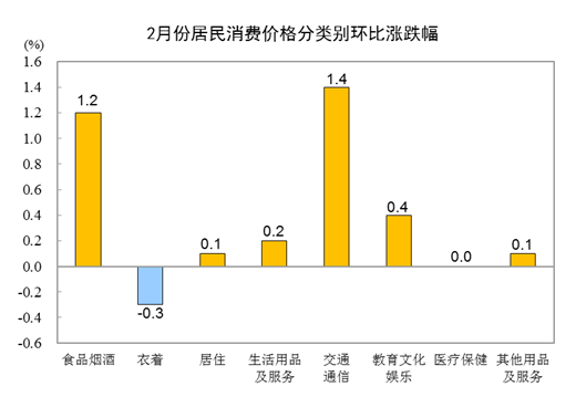 2月份,食品烟酒类价格环比上涨1.2%,影响CPI上涨约0.34个百分点。食品中,鲜菜价格上涨6.0%,影响CPI上涨约0.14个百分点;水产品价格上涨4.8%,影响CPI上涨约0.09个百分点;鲜果价格上涨3.0%,影响CPI上涨约0.06个百分点;蛋类价格下降3.1%,影响CPI下降约0.02个百分点;畜肉类价格下降1.5%,影响CPI下降约0.05个百分点,其中猪肉价格下降4.6%,影响CPI下降约0.06个百分点。