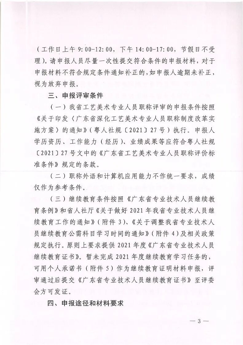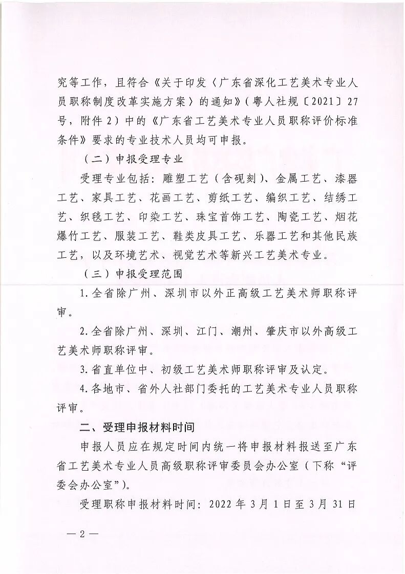 2、申报评审对象需符合《关于印发〈广东省深化工艺美术专业人员职称制度改革实施方案〉的通知》(粤人社规〔2021〕27号,附件2)中的《广东省工艺美术专业人员职称评价标准条件》。