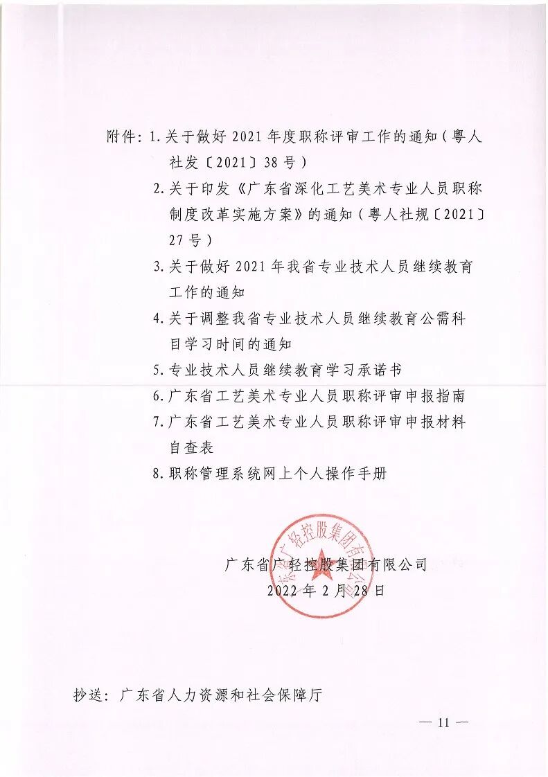 根据广东省广轻控股集团有限公司《关于开展2021年度广东省工艺美术专业人员职称评审工作的通知》(粤广轻人事2022﹝11号﹞)要求,广东省工艺美术专业人员高级职称评审委员会于2022年3月1日至3月31日受理申报材料(工作日上午9:00-12:00,下午14:00-17:00,节假日不受理)。