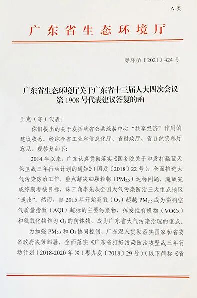 资料图:广东省生态环境厅书面答复王克代表有关公共涂装工作的建议