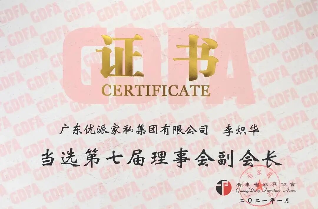在广东省家具协会成立三十周年庆典上,优派集团连任广东省家具协会第七届理事会副会长单位,集团董事局主席李炽华先生连任广东省家具协会第七届理事会副会长。