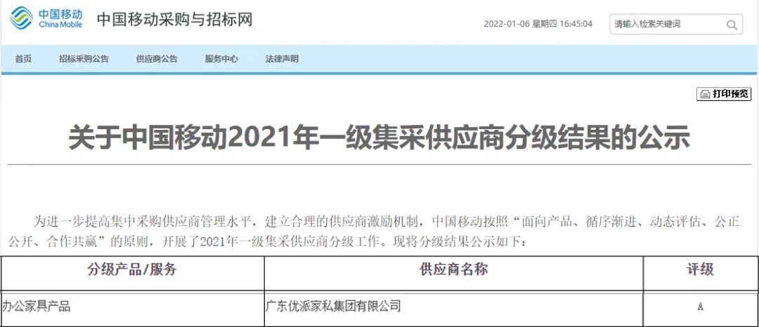凭借着长期、稳定的发展,过硬的产品品质,集团在中国移动供应商分级评选中被评为办公家具类唯一A级供应商。在各类目供应商中,获得A级评定的供应商屈指可数,均为各行业龙头企业。
