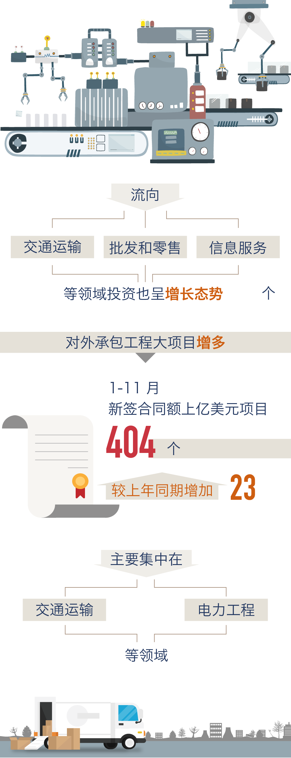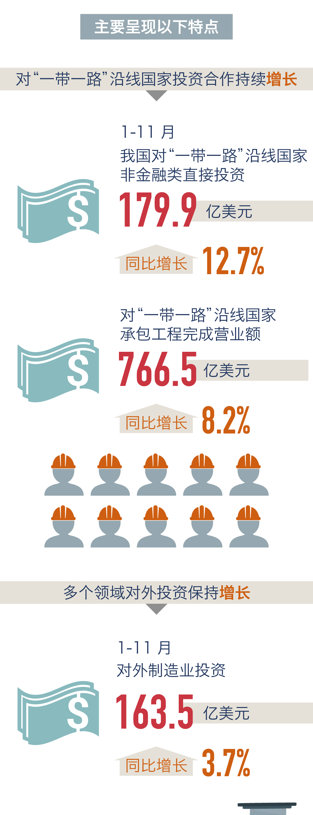 近日,商务部举行例行新闻发布会,商务部新闻发言人高峰通报了2021年1-11月我国对外投资合作情况,今年1至11月,我国对外非金融类直接投资6403.8亿元人民币,同比下降2.9%(折合991.3亿美元,同比增长4.3%)。对外承包工程完成营业额8564.7亿元人民币,同比增长2.6%(折合1325.8亿美元,同比增长10.1%)。