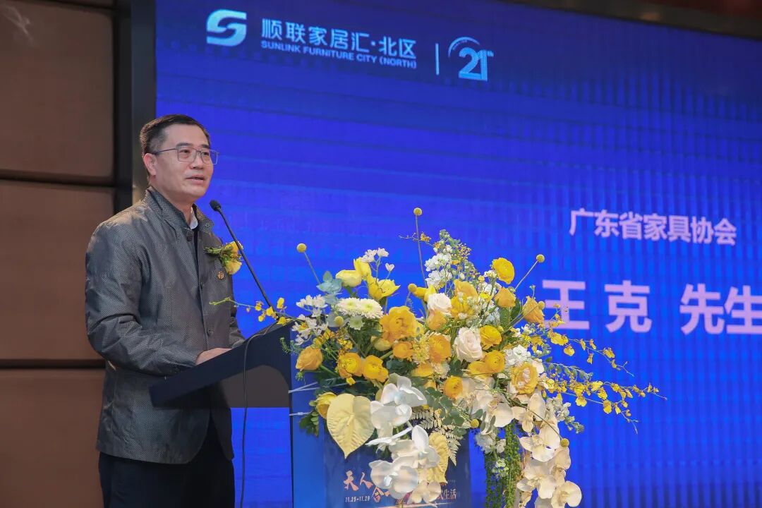 开幕式上,王克会长代表广东省家具协会对长期关心支持我省红木家具产业发展的社会各界表示衷心感谢,并就“如何通过展贸联动,当好红木家具文化传播和市场开拓者”谈了三点意见。一、坚定信心与锐意进取。今年,广东家具人直面困难锐意进取,积极参与省政府开展的广东省贸易高质量发展十大工程之一的“粤贸全国”计划,实施“三品”战略,我省家具行业重视办好中国(广州)家博会等4个大型展会和一批中小展览展销,各大家居卖场和商户联手家具生产企业,摸索国内国际市场的应对策略,取得一定成效,预计全年我省家具销售总额达4750亿元。二、行业30年与未来展望。三十年来,广东家具行业突飞猛进,已成为中国家具行业重要生产、出口、市场基地,并一直处于龙头地位,赢得“中国家具看广东”美誉。未来5年乃至15年,广东家具行业必须抓住这一发展关键时期的历史机遇,调整产业结构和发展节奏,集中优势打一场战略决战,推动广东家具制造业由大变强,实现中国家具制造业再次腾飞。三、坚持传承与展会创新。红木家具作为中国传统文化的优秀载体,不仅体现了丰富的历史文化底蕴,如今,更以一种新的方式融入中国人的家,并演绎为一种新式生活流行。乐从红木家具展是广东省家具协会与顺联家居汇合作的项目,历经十五载的发展,坚持以展贸联动为主线,既有效地提升红木艺术鉴赏水平,又有利于促进红木家具贸易和市场流通。希望顺联家居汇抓住坚持、创新两大原则,每年不断创新红木展形式和内涵,打造更优秀的展贸联动平台,在提升顺联家居汇品牌价值的同时,为广大商户和消费者提供更优质的服务,为扩大国内大循环做出积极贡献。