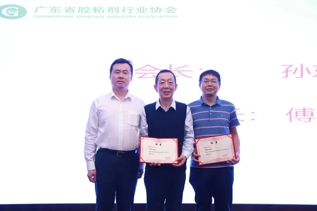 中国胶粘剂和胶粘带工业协会杨栩秘书长为新当选的会长孙东成、常务副会长傅和青颁发证书。