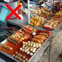 路边摊上的烤肉串、烤肠、切好分装的水果和点心等,食材来源、清洁卫生状况无法得到保证,食用后轻则腹痛,重则发生“旅行者腹泻”,出现发热、呕吐、腹泻,甚至食物中毒,得不偿失。