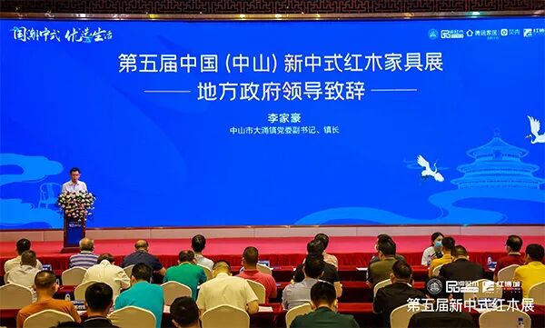 中山市大涌镇党委副书记、镇长李家豪在讲话中肯定了新中式红木展取得的成果,他说,展会紧抓新国风、新国潮概念,为红木企业发展开辟了新赛道,让国人进一步感受到当代雅致中式生活魅力,同时推动红木原创设计的发展,引领新中式家具发展的新浪潮。