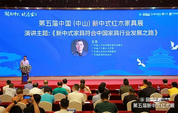 广东省人大社会建设委员会委员、广东省家具协会会长王克出席了本次开幕仪式并发表了题为《新中式家具符合中国家具行业发展之路》的重要讲话,总结了新中式家具发展的3个关键词:一,文化自信,消费升级,方向正确,持续推进;二,发展新中式家具,倡导新生活方式;三,创新驱动,设计引领,优质优价,绿色发展。为今后产业的发展指明了方向。王会长指出,广东省家具协会2009年开始与红古轩公司合作举办“红古轩杯”全国新中式家具设计大赛,吸引了广大的院校师生、设计师参与,大大推动了我国新中式家具的设计创新工作,越来越多的设计公司、家具骨干企业加入到新中式家具的行列,目前新中式家具产品国内市场份额已经超过30%,未来还将继续提高到40%、50%。对此,希望广大的家具企业和经销商加大新中式家具、新中式红木家具的拓展力度,为助力构建国内大循环为主体、国内国际双循环相互促进新格局发挥积极作用,为促进广东家具行业高质量发展做出新的贡献!